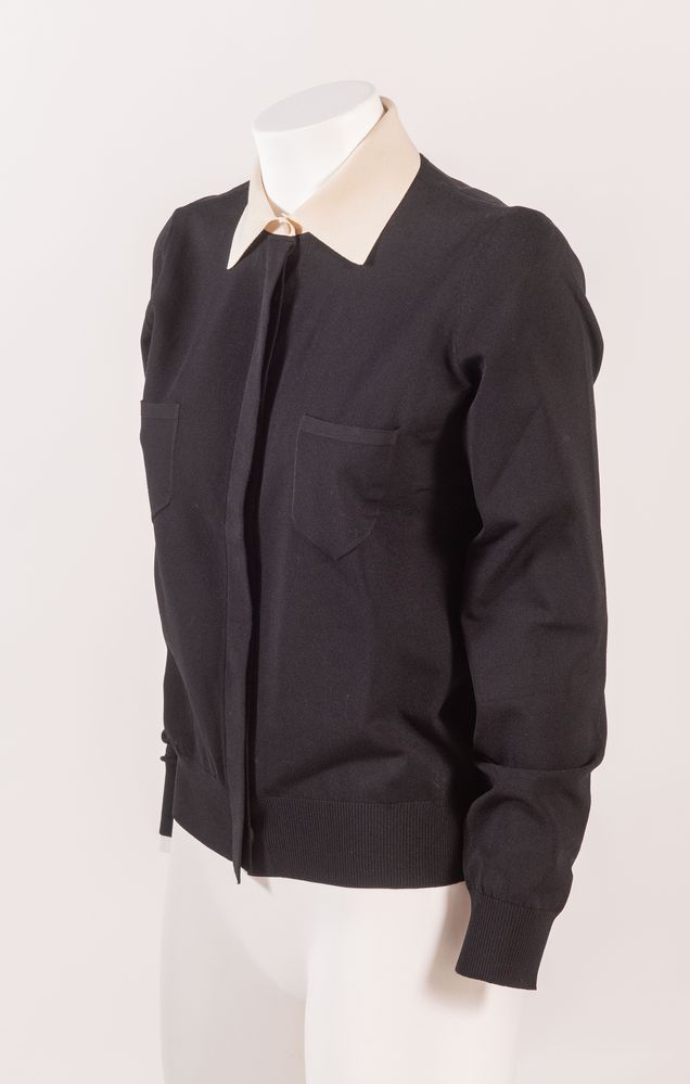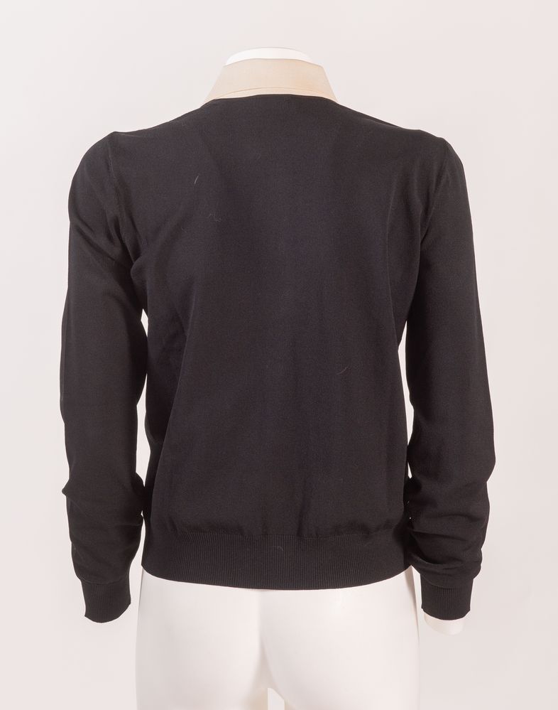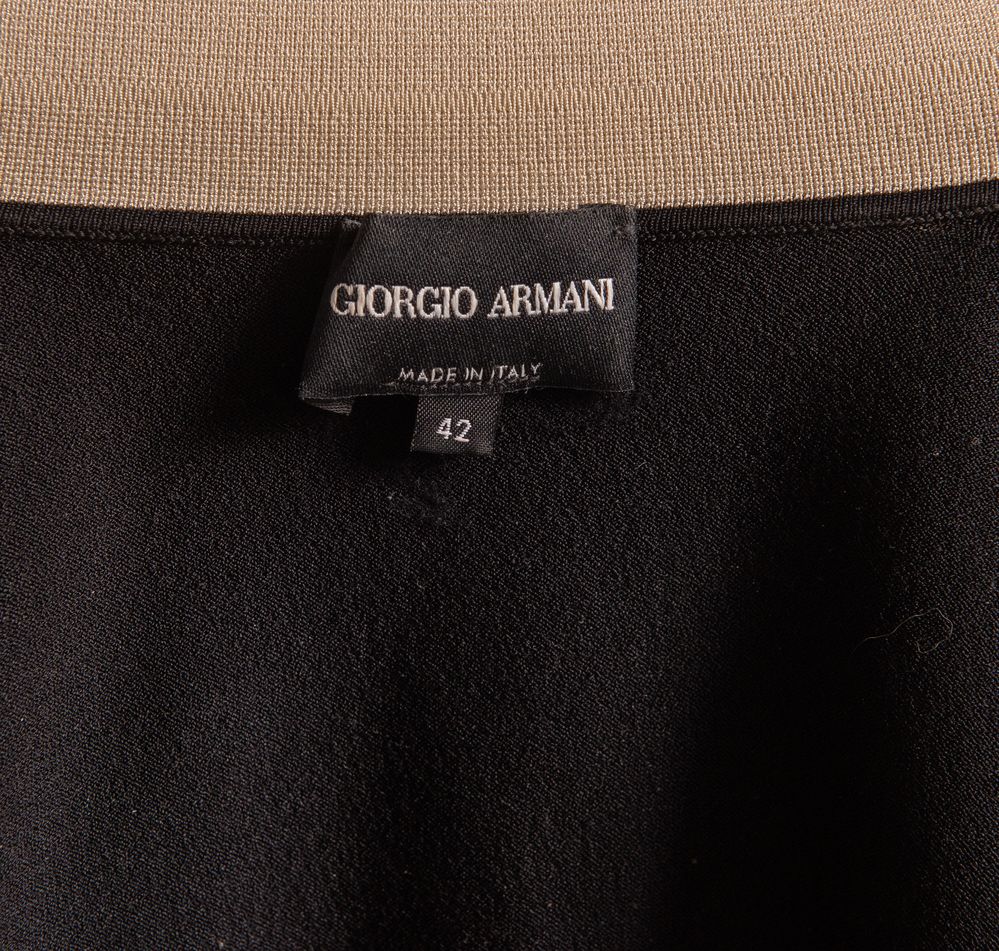 GIORGIO ARMANI Cardigan a maniche lunghe in viscosa sui toni del nero con colletto color panna. Riporta taglia 42. Composizione: 83% viscosa, 17% poliestere. Reca etichetta Giorgio Armani Made in Italy.