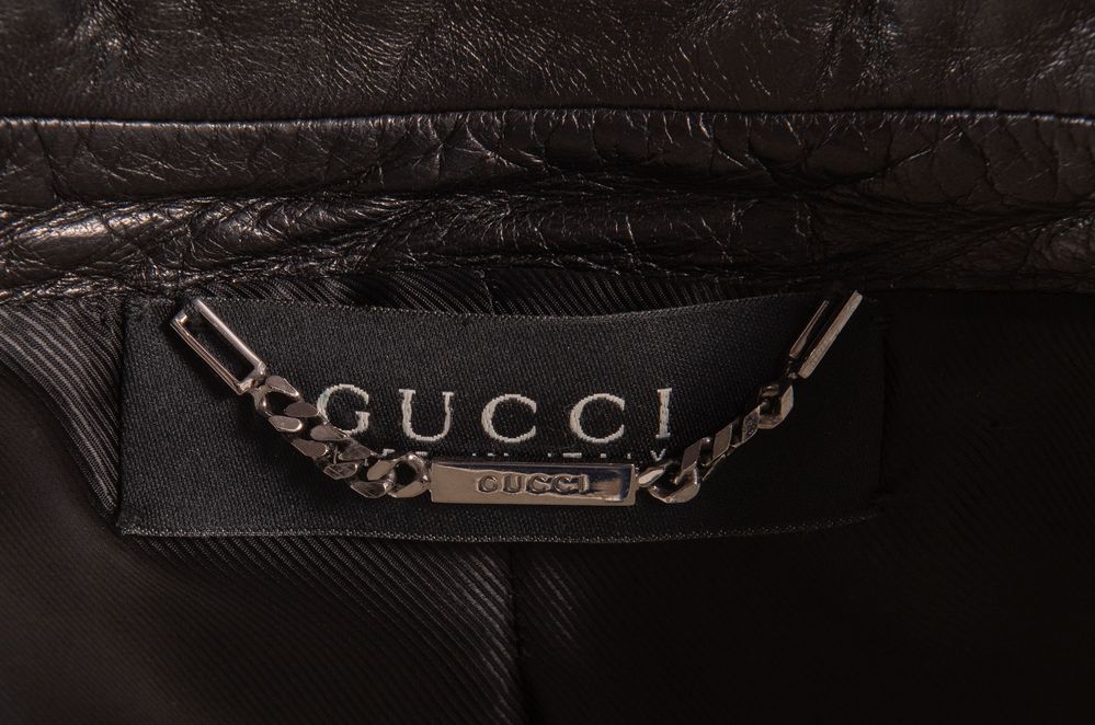 GUCCI Giacca in pelle nera. Riporta taglia 46. Interno rifinito con fodera nera. Composizione esterno: 100% vera pelle. Composizione interno: 100% cupro. Reca marchio Gucci ed etichetta Gucci Made in Italy. (Difetti)