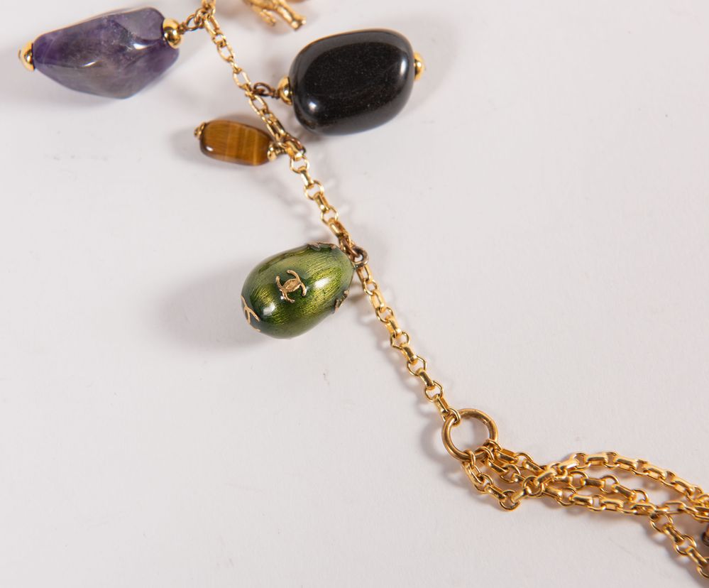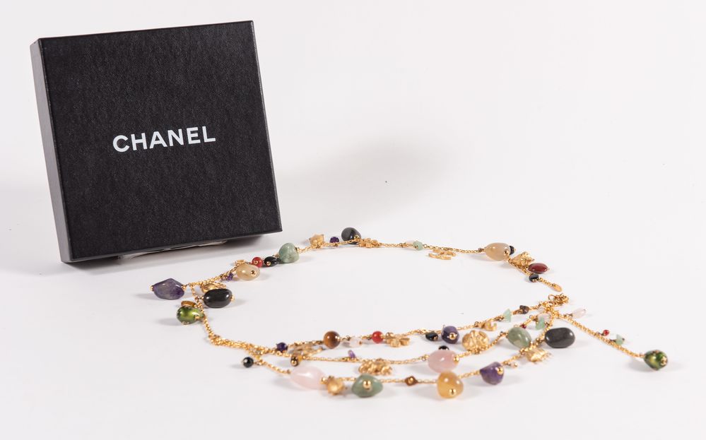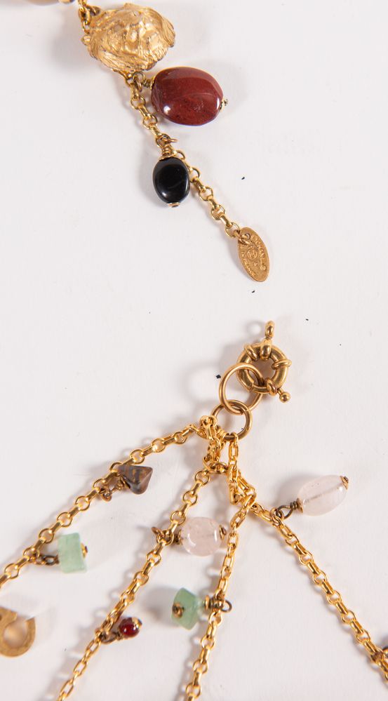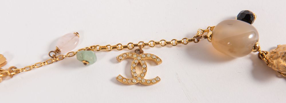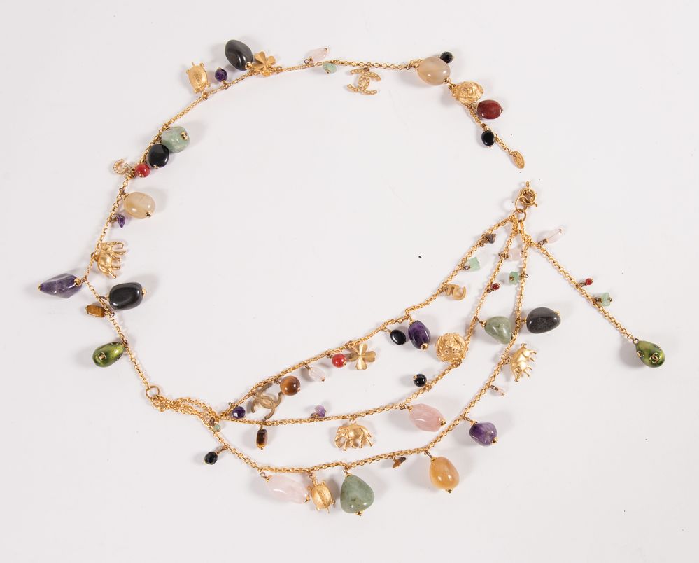 CHANEL Cintura a tre fili di catena realizzata in metallo dorato e interamente arricchita da numerosi charms di pietre dure multicolori e altri di forma e soggetto diversi. Primi anni 2000. Lunghezza totale: cm 89. Reca marchi CC e Chanel 01 A Made in France. Corredata di scatola originale. (Lievi difetti)