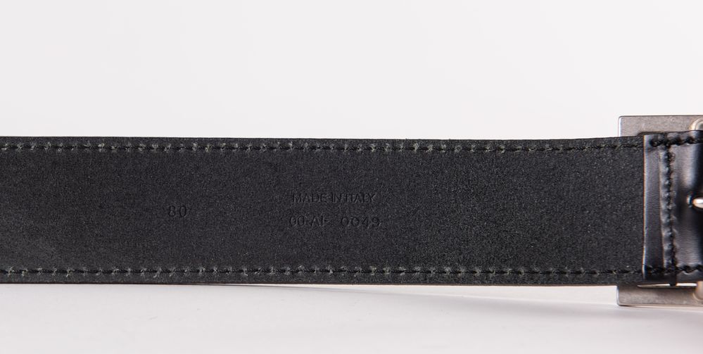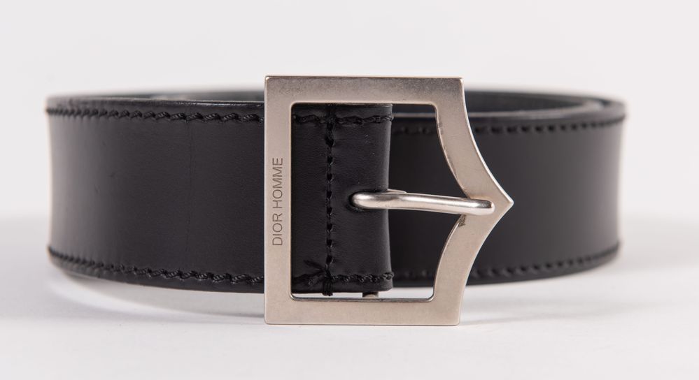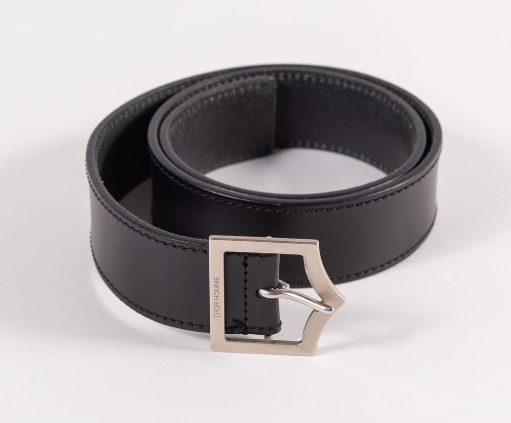 DIOR Cintura in pelle nera con fibbia in metallo argentato. Lunghezza totale: cm 99. Spessore fascia: cm 4. Fibbia: cm 5,3x5,5. Riporta misura 80. Reca marchi Dior Homme, Dior, Made in Italy e codice di riferimento. (Lievi difetti)