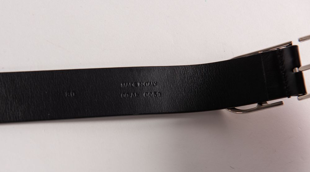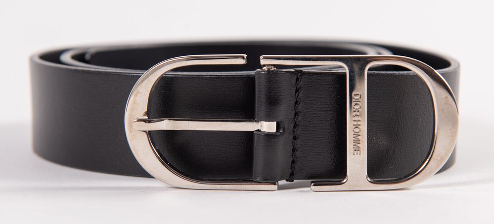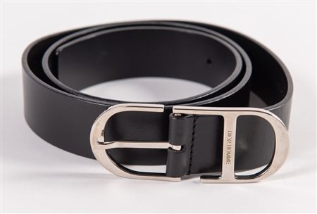 DIOR Cintura in pelle nera con fibbia in metallo argentato. Lunghezza totale: cm 96. Spessore fascia: cm 2,8. Fibbia: cm 3,5x9. Riporta misura 80. Reca marchi Dior Homme, Dior Made in Italy e codice di riferimento prodotto. (Lievi difetti)
