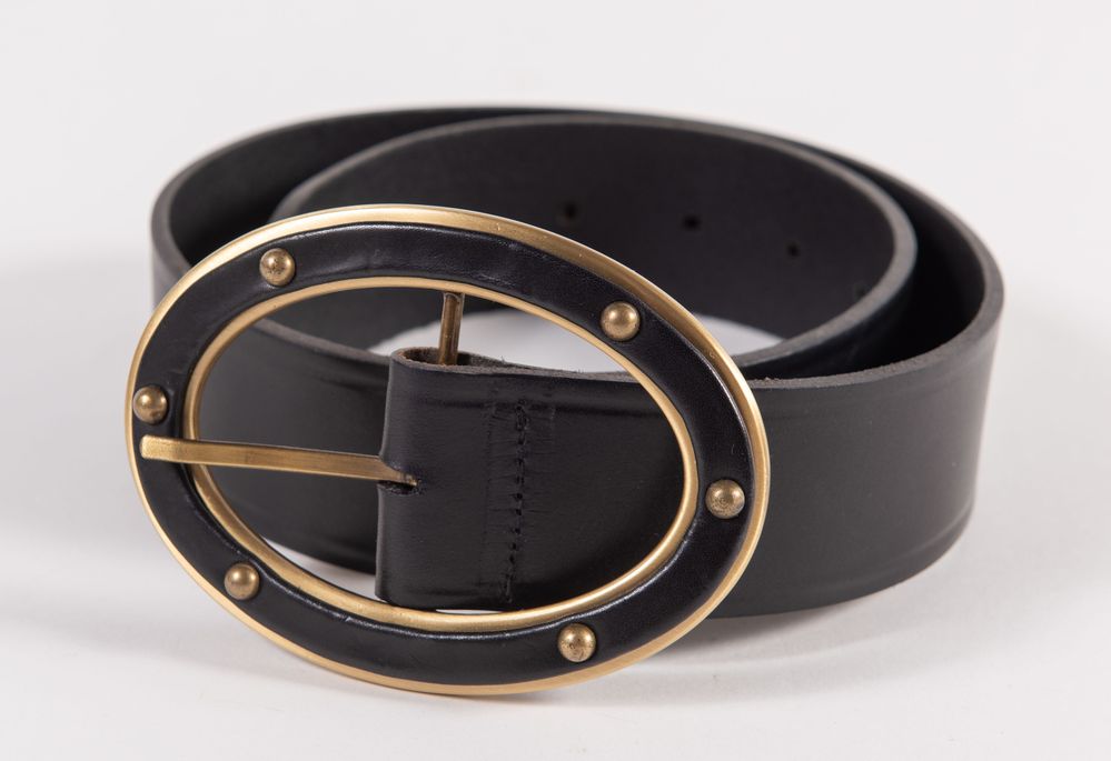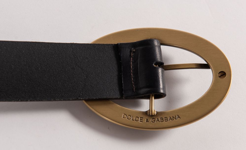 DOLCE&GABBANA Cintura in pelle nera con fibbia in metallo dorato rivestita in pelle nera. Lunghezza totale: cm 84. Spessore fascia: cm 4. Fibbia: cm 7,5x10,5. Reca marchio Dolce&Gabbana. (Lievi difetti)