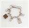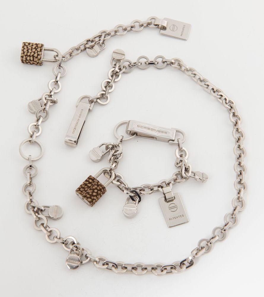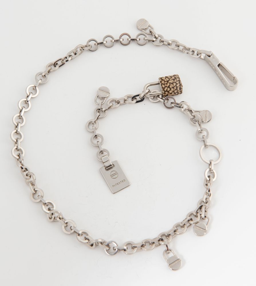 BORBONESE Parure composta da collana e bracciale in metallo argentato arricchiti con charms. Lunghezza totale collana: cm 78,7x3,5. Lunghezza totale bracciale: cm 22x3,5. Ciascun elemento reca marchi Borbonese, Patented. (Lievi difetti)
