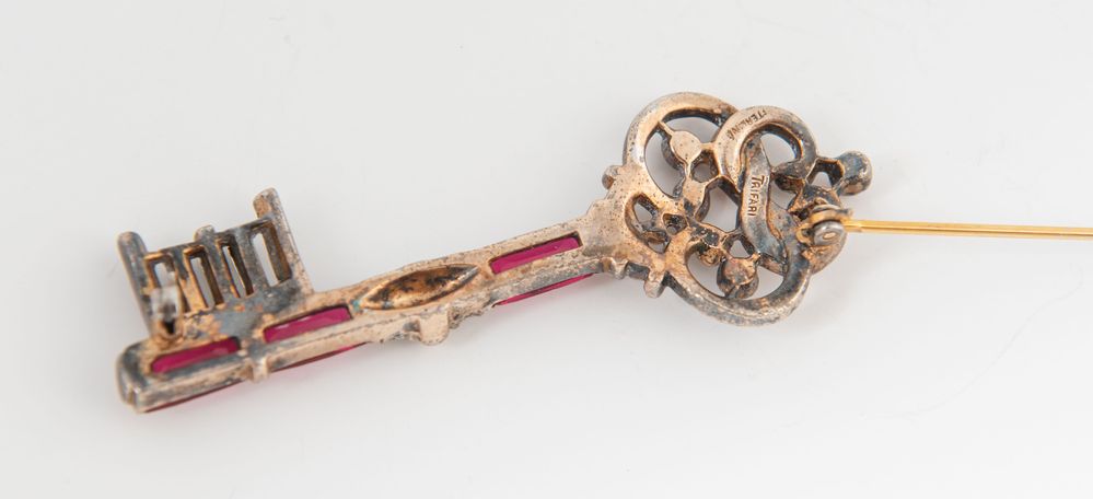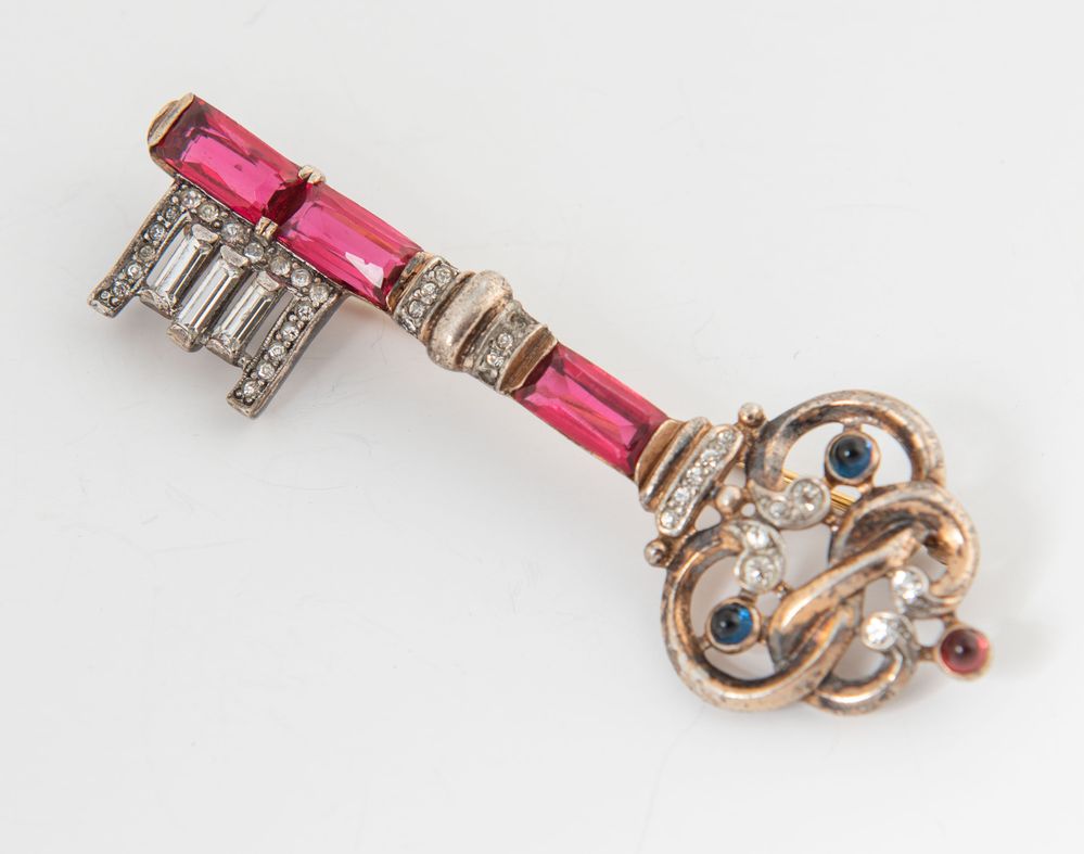 TRIFARI Spilla a forma di chiave realizzata in argento sterling dorato e arricchita da pietre vitree di vario colore e da zirconi. Anni '40. Cm 7x2,8. Reca marchi Trifari e sterling. (Difetti)