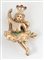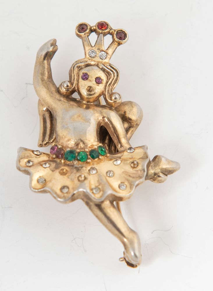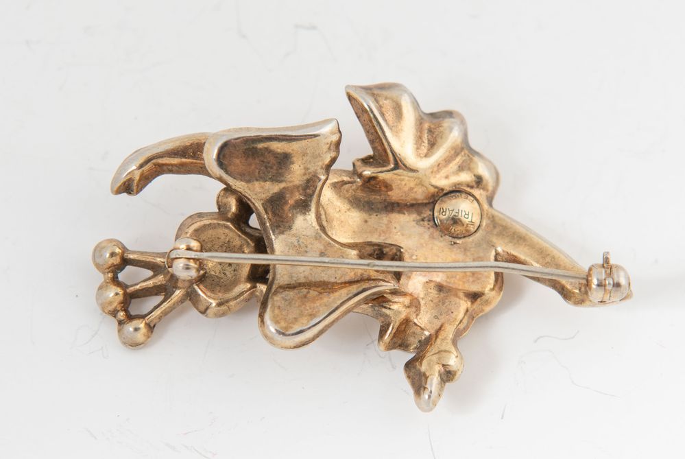 TRIFARI Spilla a forma di angioletto in argento dorato arricchita da zirconi di vario colore. Anni '50 ca. Cm 5x3. Reca marchio e punzoni Pat. Trifari Pend. (Difetti)