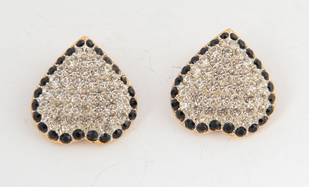 NINA RICCI Orecchini a clip a forma di cuore in metallo dorato decorati da pavè di pietre sintetiche nere e ad imitazione del diamante. Cm 2,8 cad. Ciascuno reca marchio Nina Ricci. (Lievi difetti)
