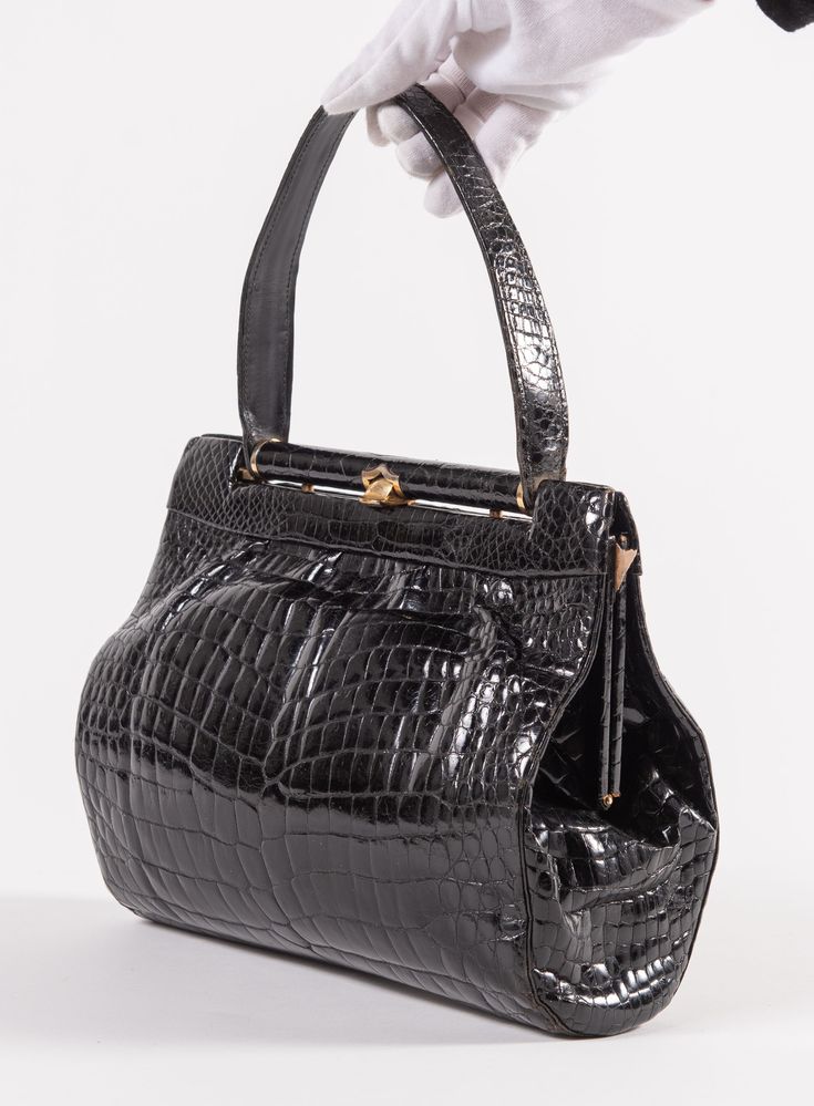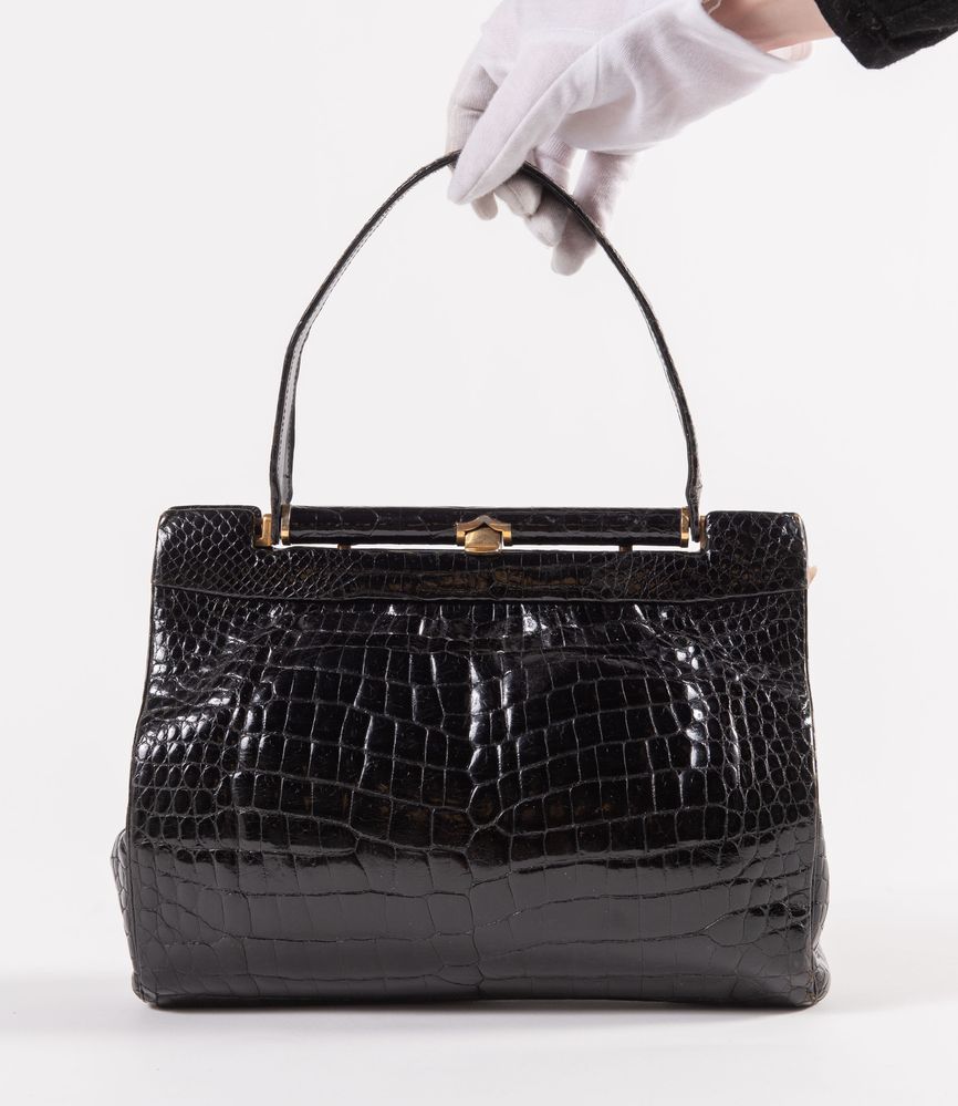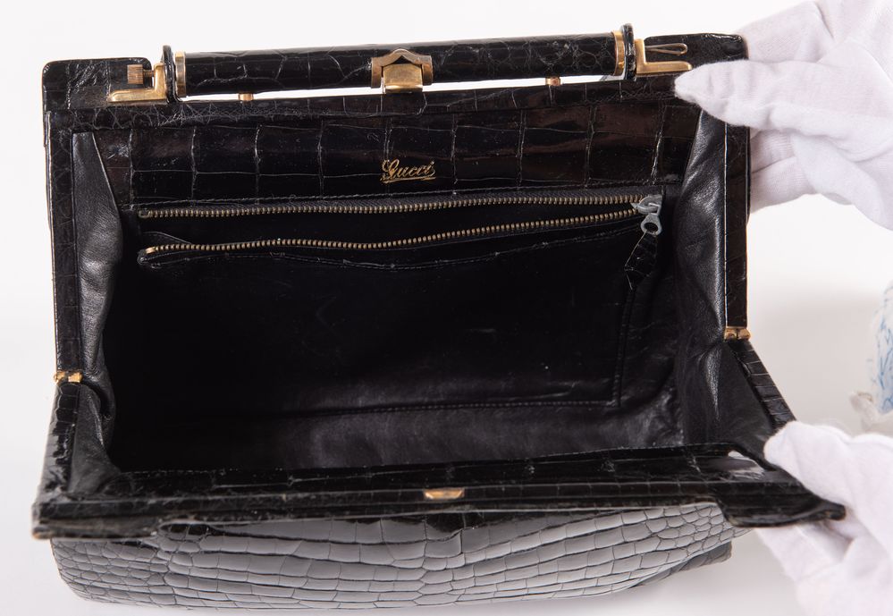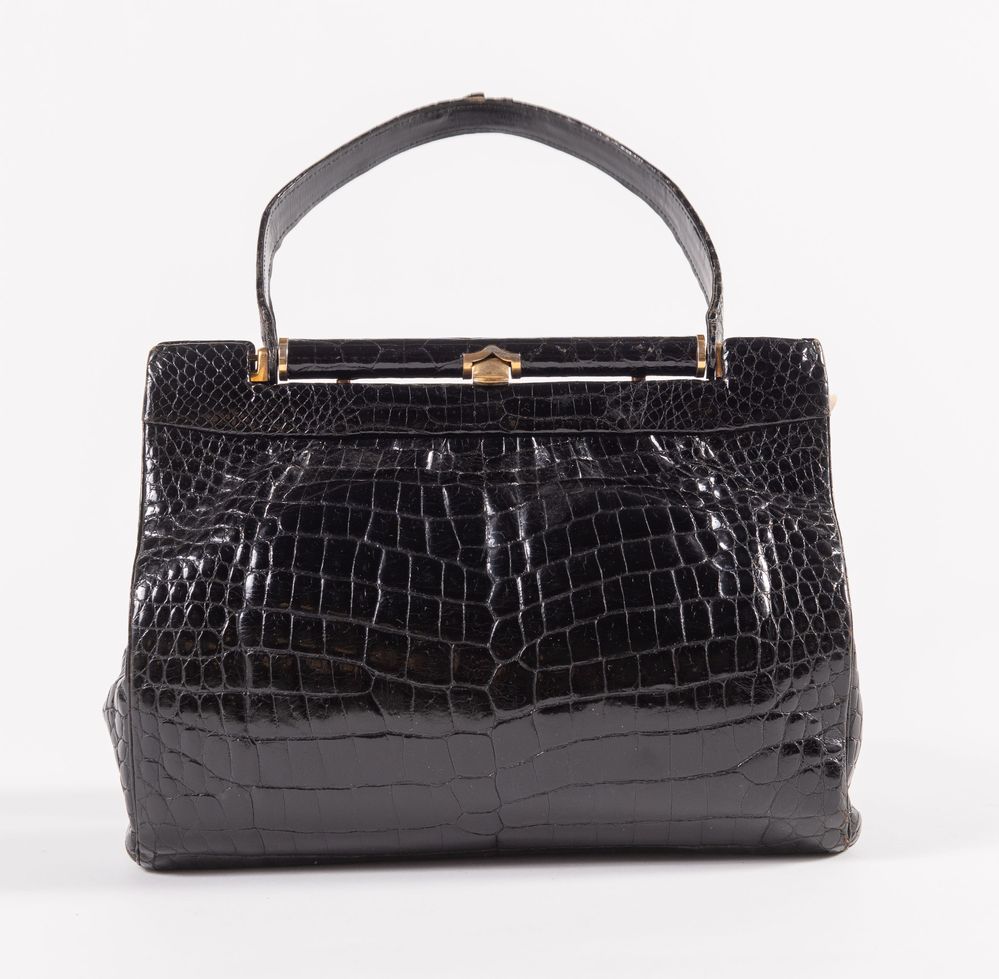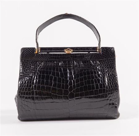GUCCI Borsa da spalla in pelle di coccodrillo nera e con dettagli in metallo dorato. Anni '60 ca. Cm 20x29x8. Altezza con manico: cm 34,5. Interno rifinito in pelle nera con due tasche di cui una chiusa da cerniera. Reca marchio Gucci. (Difetti)