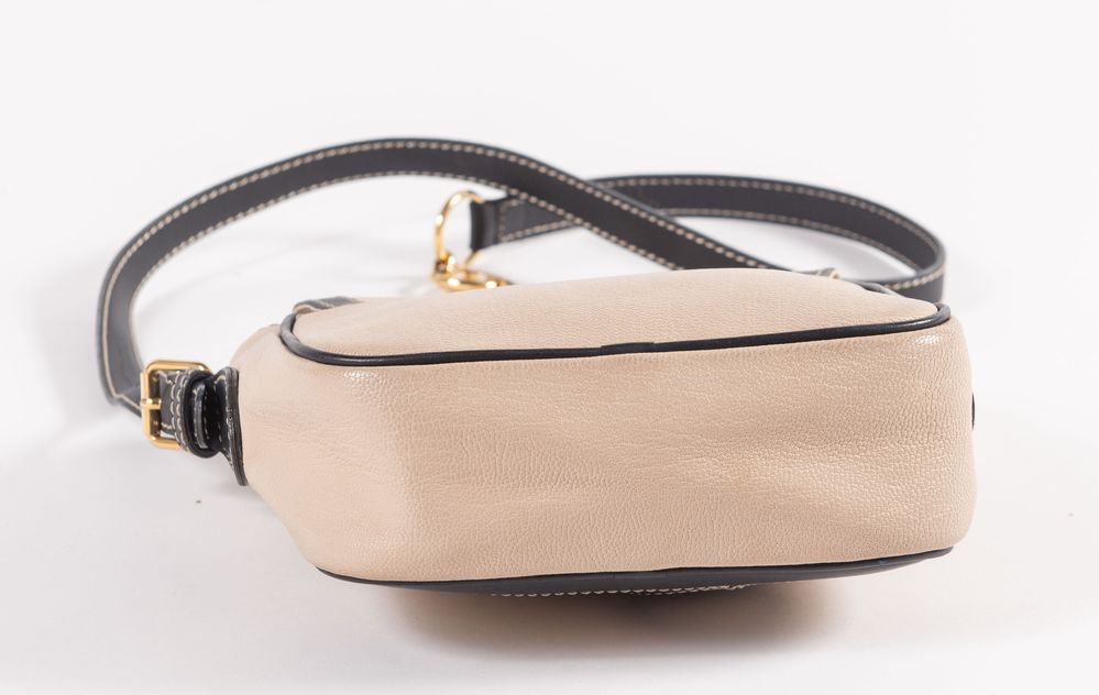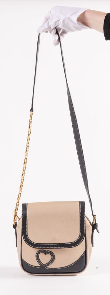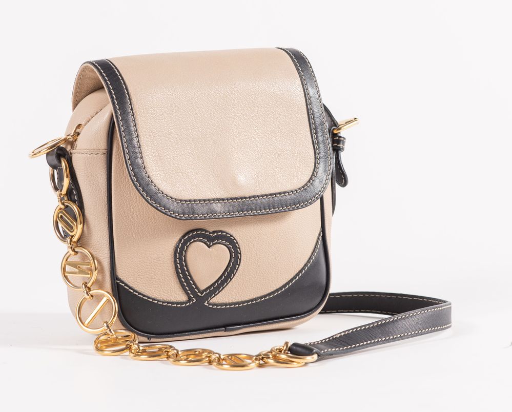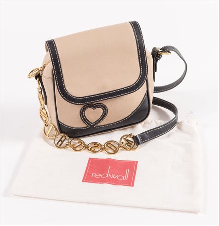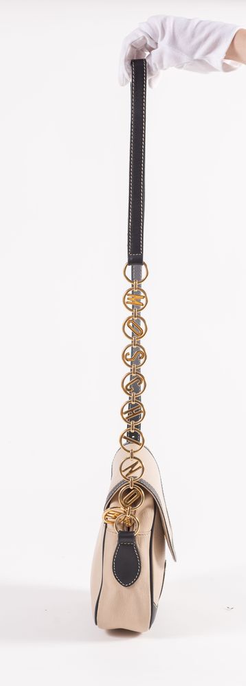 MOSCHINO for Redwall Borsa a tracolla/da spalla in pelle liscia e lavorata beige e nera con dettagli in metallo dorato. Cm 20x20x6,5. Altezza con manico: cm 72. Interno foderato in tessuto nero logato Redwall con una tasca chiusa da cerniera. Reca marchi M, Moschino, Centopercento Moschino e Redwall Made in Italy. (Lievi difetti)
