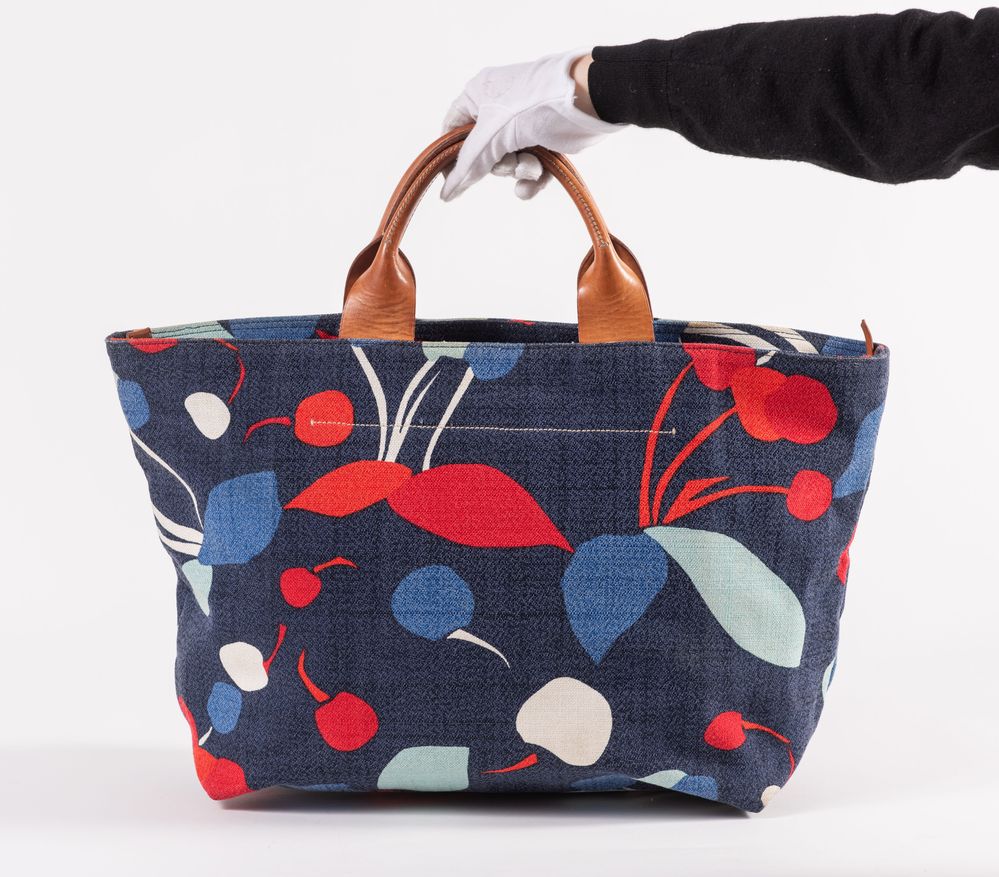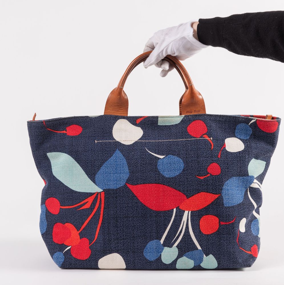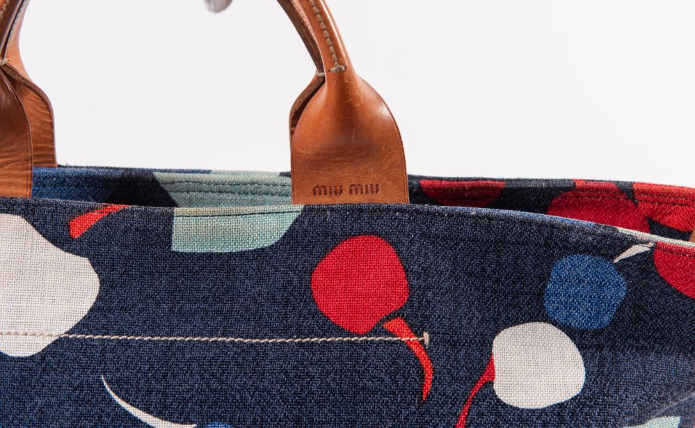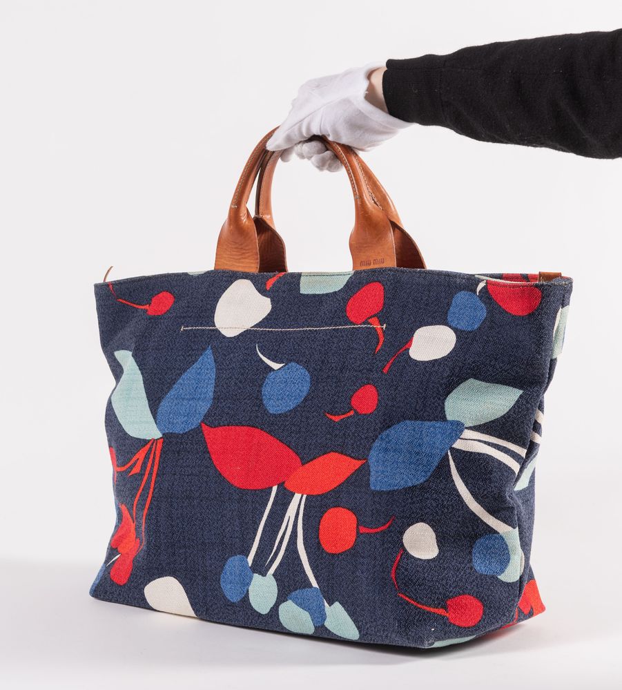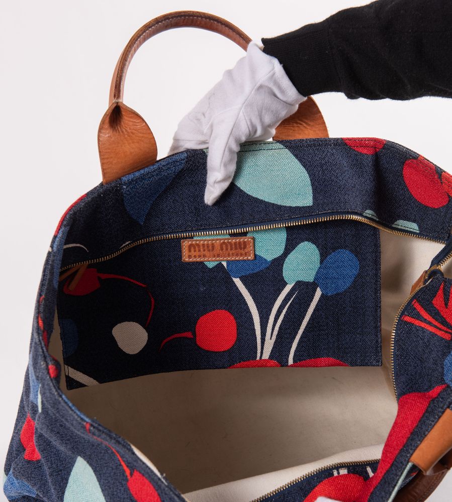 MIU MIU Borsa da spalla in tessuto denim stamapato con rifiniture in cuoio con dettaglio della cerniera in metallo dorato. Cm 35x54x17. Altezza con manici: cm 50. Interno rifinito in tela con una tasca chiusa da cerniera. Reca marchi Miu Miu, Miu Miu Made in italy. (Difetti)
