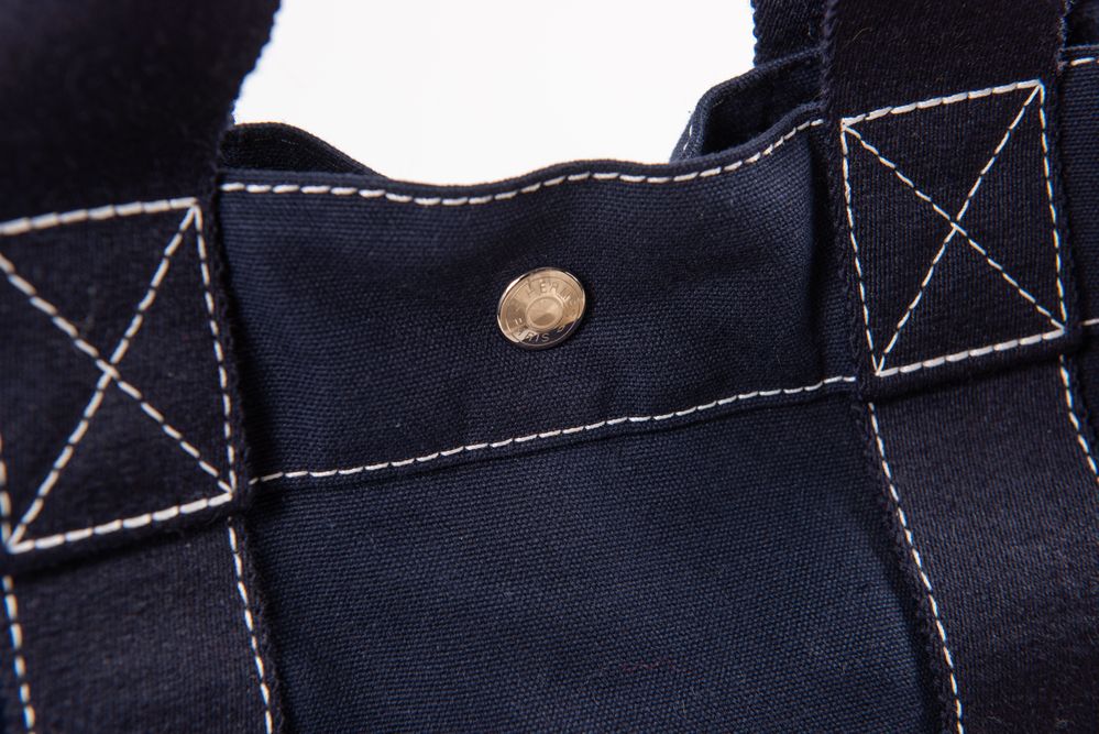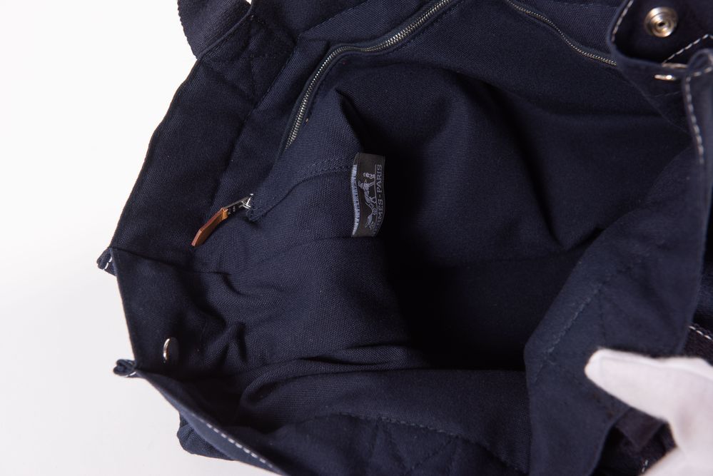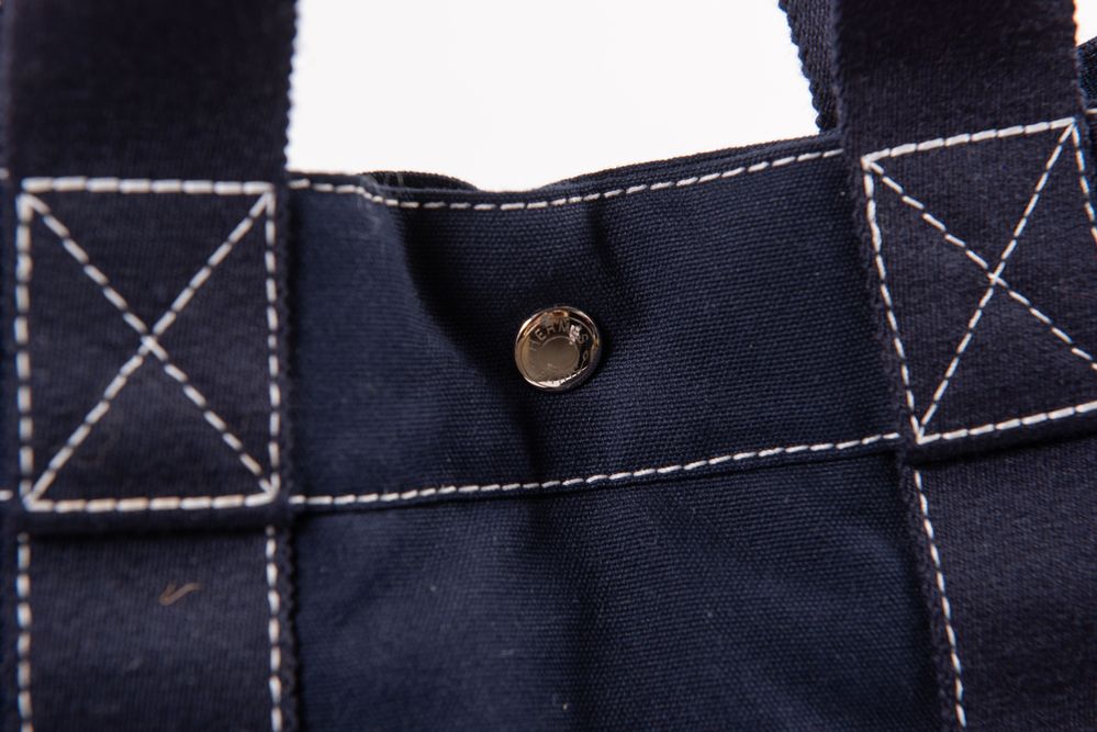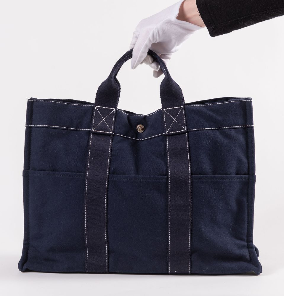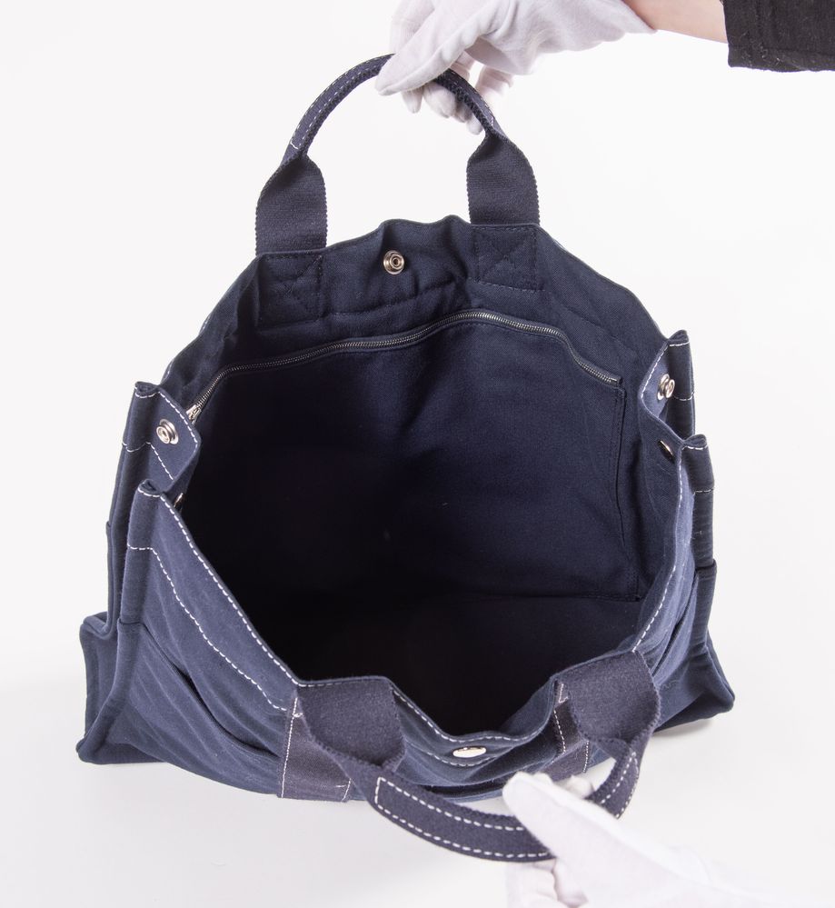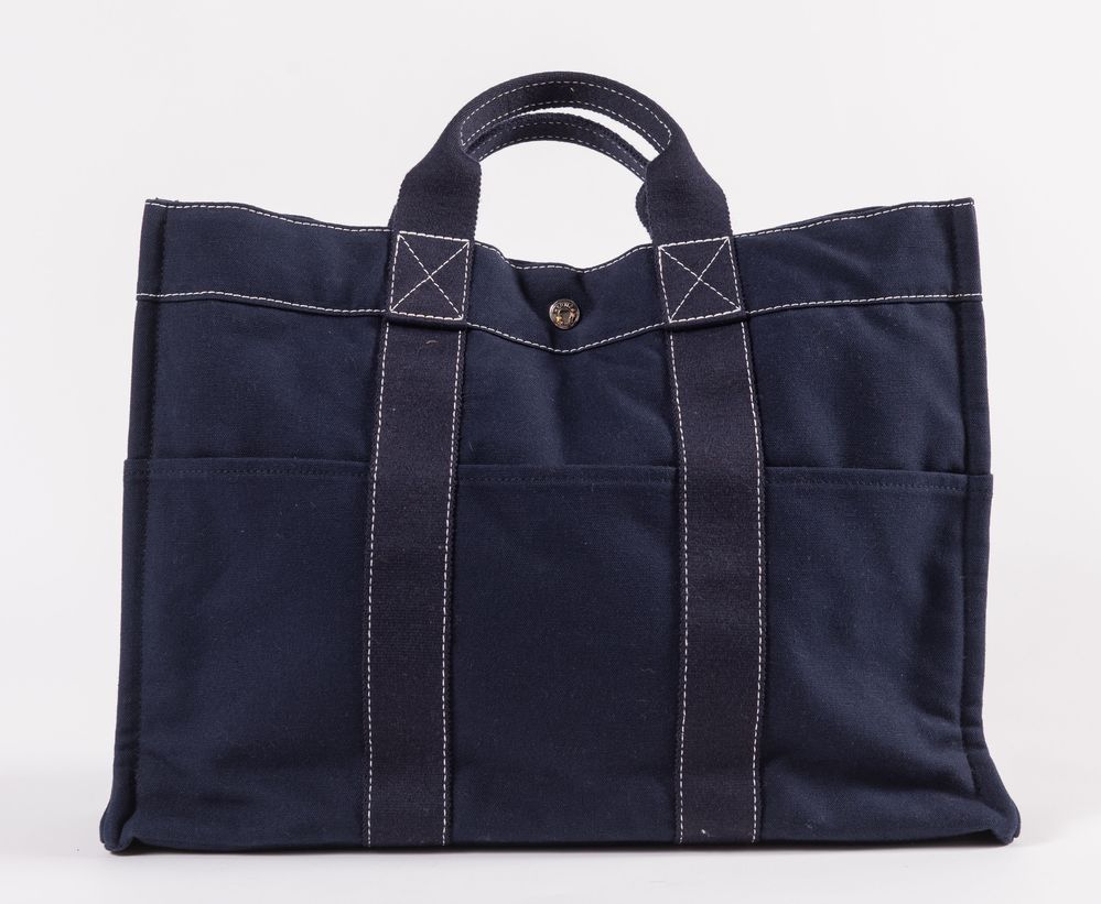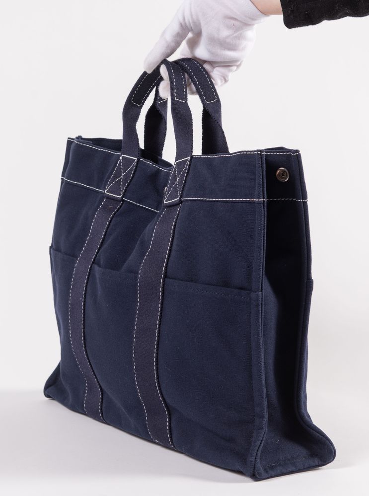 HERMÈS Borsa in tela di cotone blu modello Toto. Cm 31x41,5x12. Altezza con manico cm: 40. In entrambi i lati esterni presenta tre tasche porta oggetti. Interno in tela con una tasca chiusa da cerniera. Composizione: 100% cotone. Reca marchi Hermès Paris ed etichetta Hermès Paris.