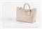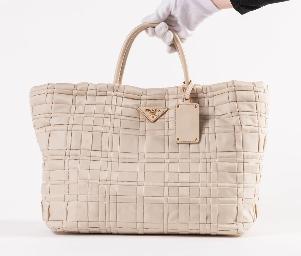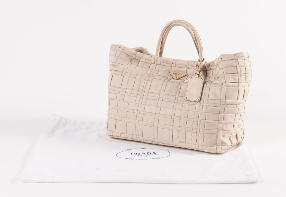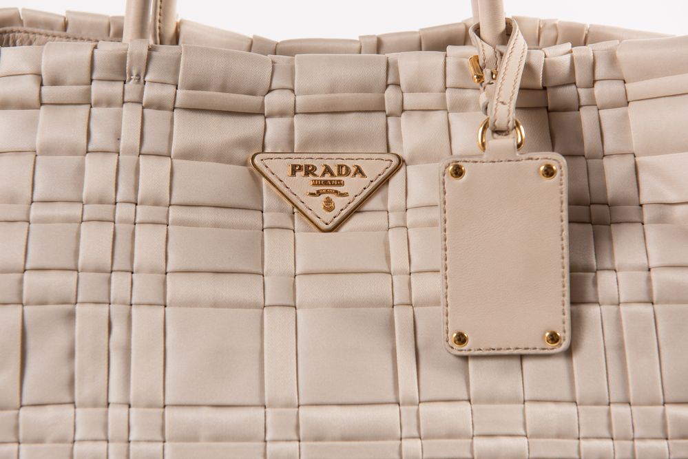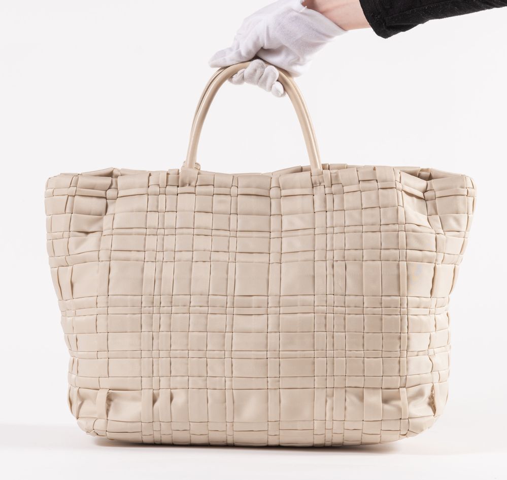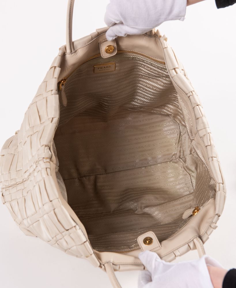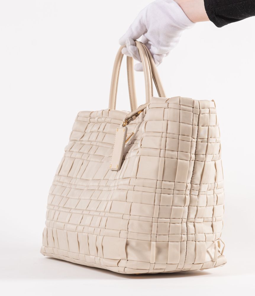 PRADA Borsa da spalla color avorio in tela Weave di nylon con rifiniture in pelle e dettagli in metallo dorato. Cm 28x47x20. Altezza con manico cm: 41. Interno rifinito in tela logata con due tasche chiuse da cerniera. Reca marchi Prada Milano dal 1913, Prada Made in Italy ed etichetta con codice di riferimento modello. Corredata di dustbag originale. (Lievi difetti)