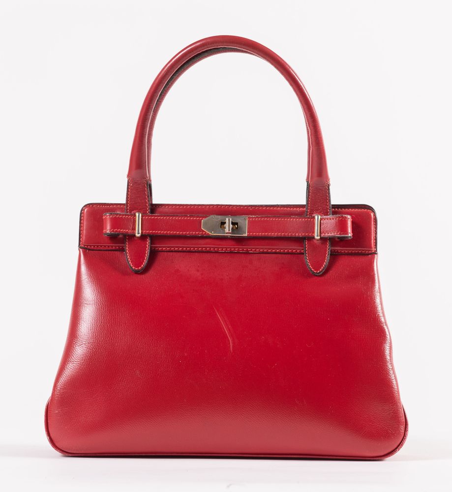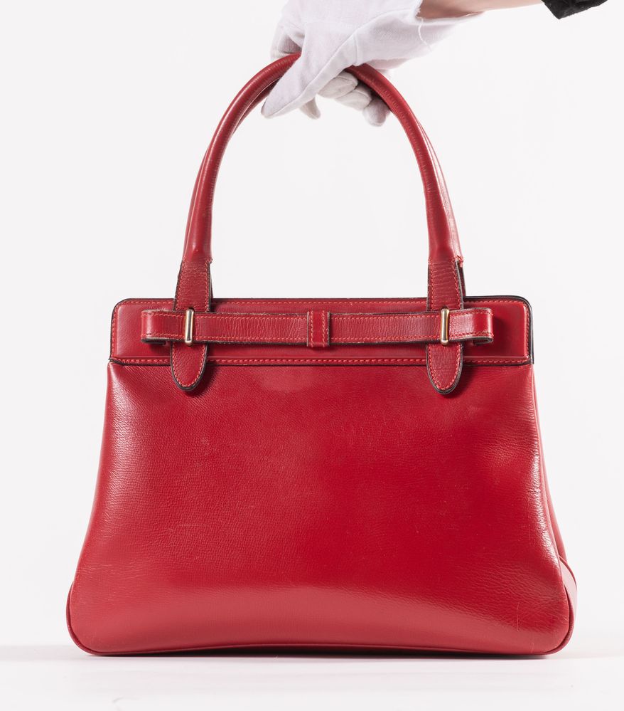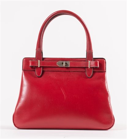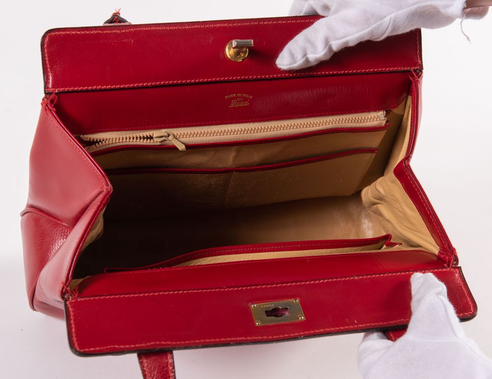 GUCCI Borsa da spalla in pelle rossa con dettagli in metallo dorato. Cm 23x32x10. Altezza con manico: cm 38. Interno in pelle beige e rossa con quattro taschine di cui una chiusa da cerniera. Reca marchi Gucci e Made in Italy by Gucci. (Difetti)