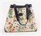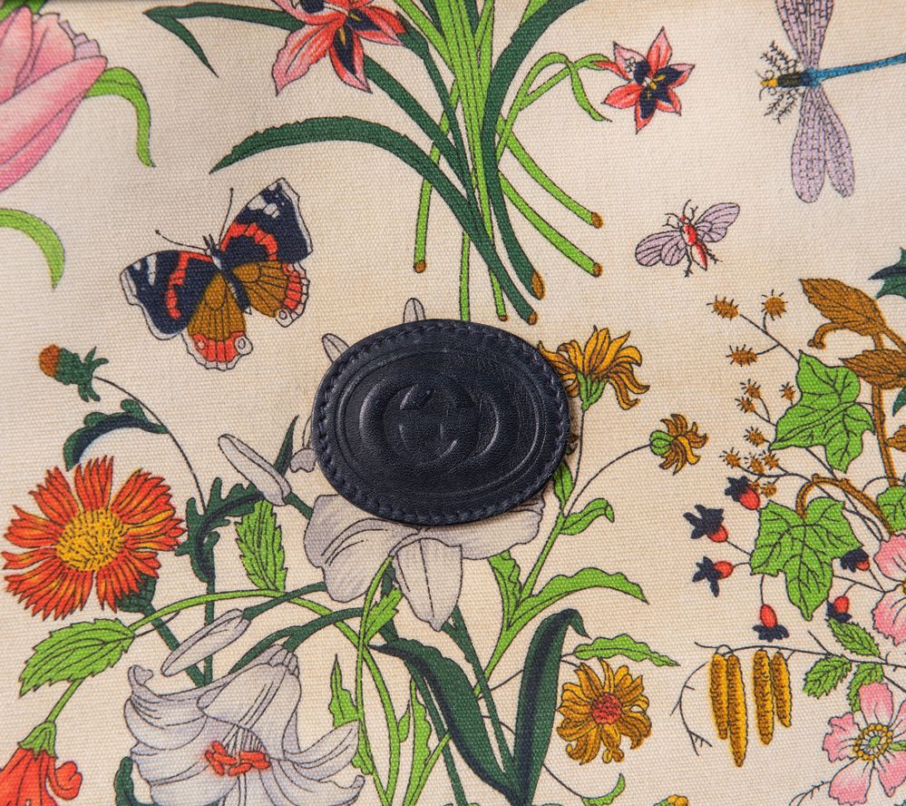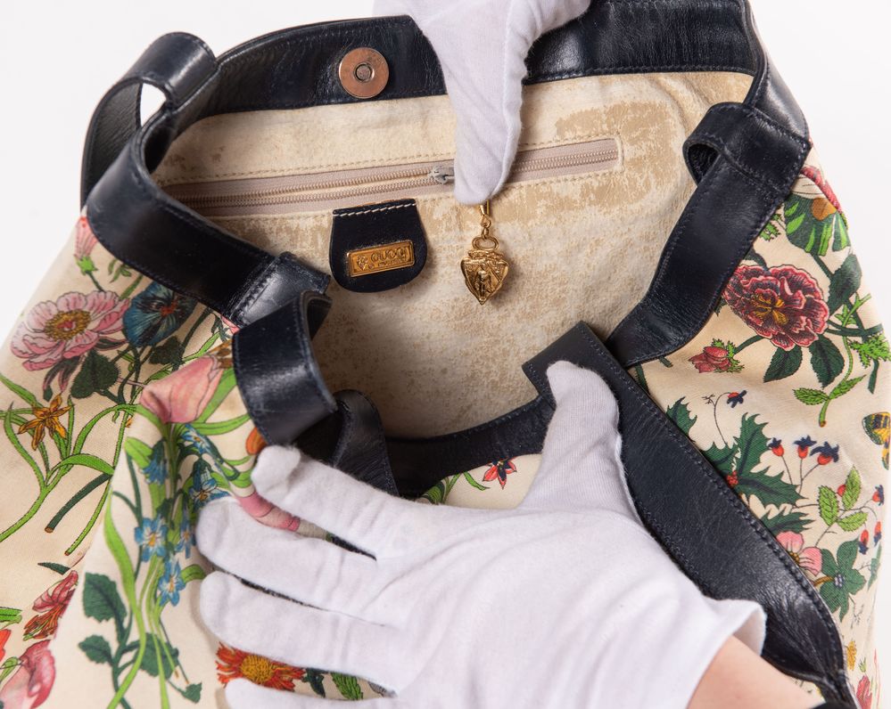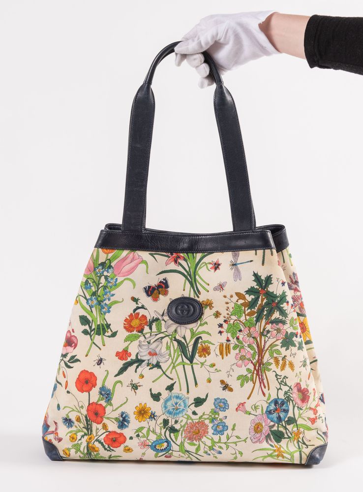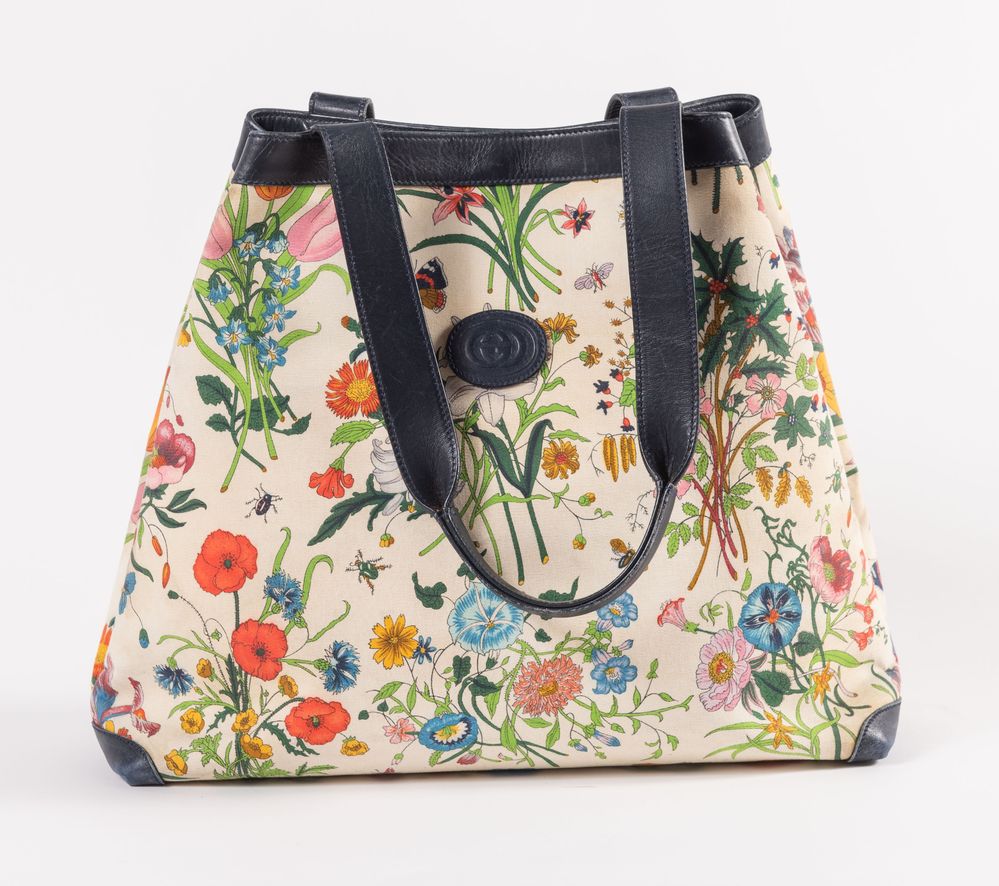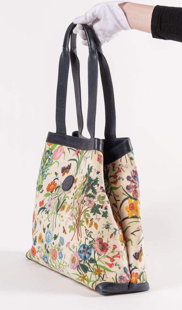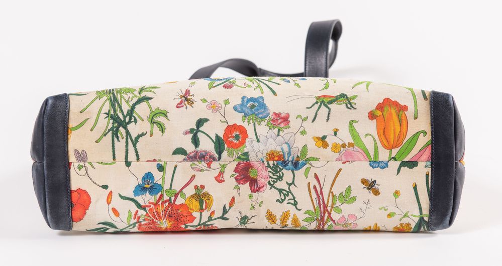 GUCCI Borsa da spalla collezione Flora in tela con fantasia floreale e rifiniture in pelle blu. Anni '70 ca. Cm 33x40x14. Altezza con manico: cm 58. Interno in tela con una tasca chiusa da cerniera. Reca marchi GG, Gucci Made in Italy, cavaliere e codice di riferimento prodotto. (Difetti)