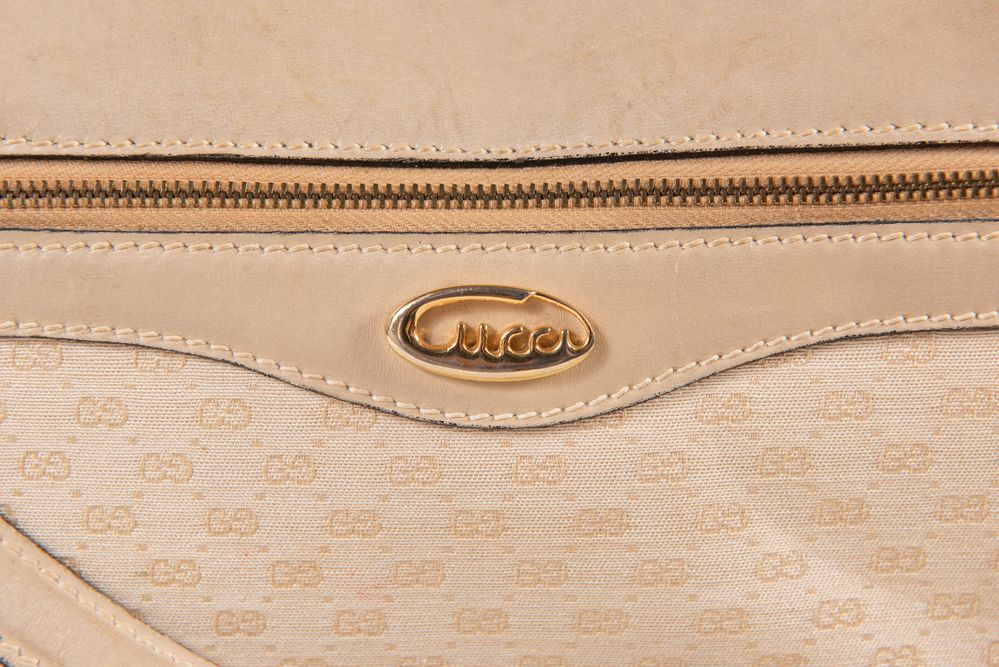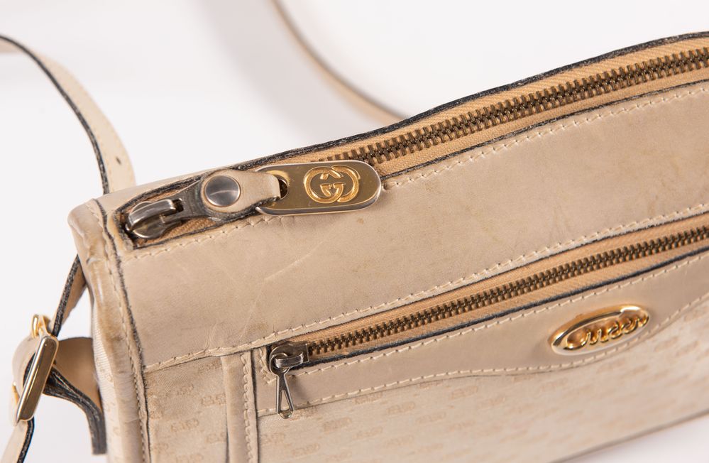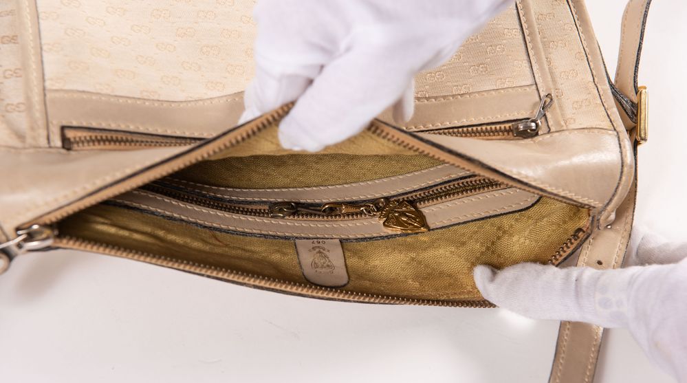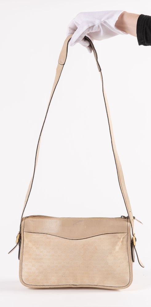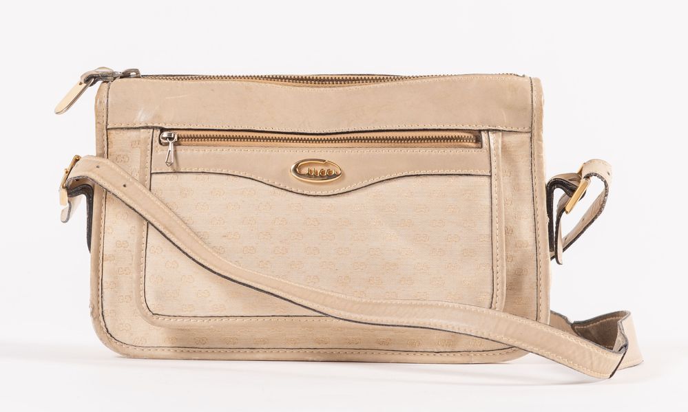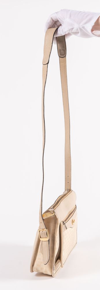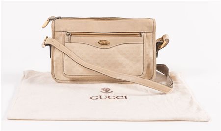 GUCCI Borsa da spalla in tela monogram e pelle con rifiniture in metallo dorato. Cm 19x29x6. Altezza con manico cm: 64. Sul lato frontale presenta una tasca chiusa da cerniera. Interno rifinito in tela con una tasca chiusa da cerniera. Reca marchi GG, Gucci, Gucci Italy, Cavaliere e probabile numero di riferimento prodotto. Corredata di dustbag. (Difetti)