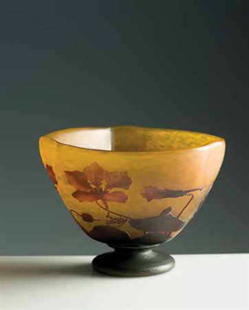 Daum. Ciotola in vetro cammeo di forma triangolare con fiori amaranto su fondo arancione, 1900 circa. Firma a cammeo: Daum Nancy cm 13,5x19,5