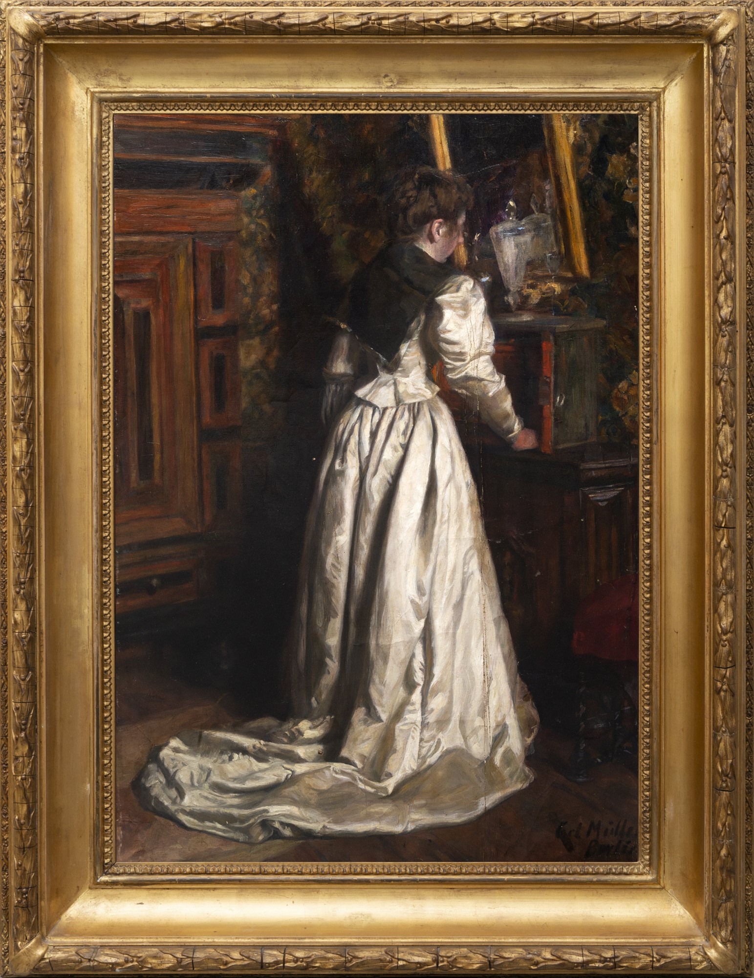 Carl Müller (Darmstadt 1818-Bad Neuenahr 1893) - Giovane donna in interno in abito bianco
