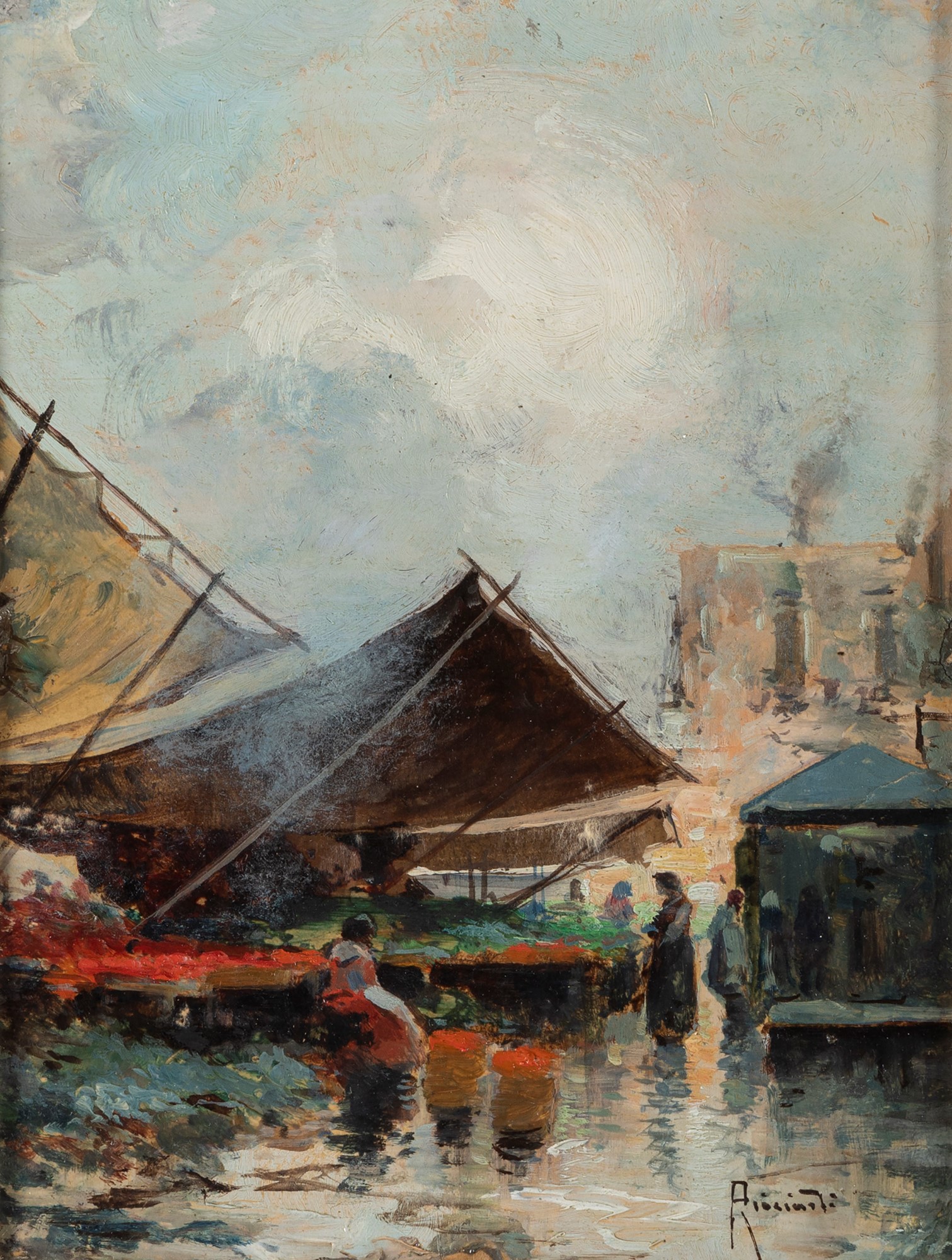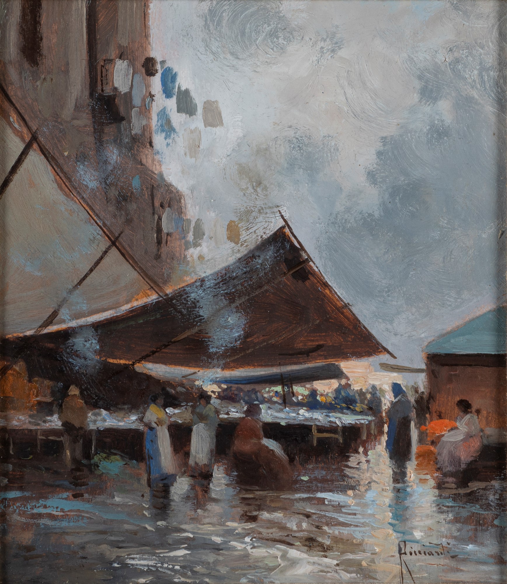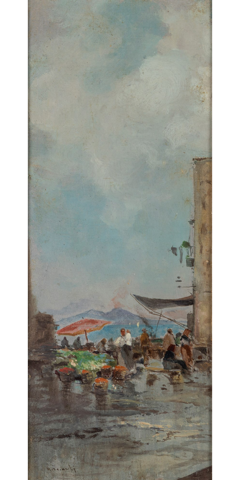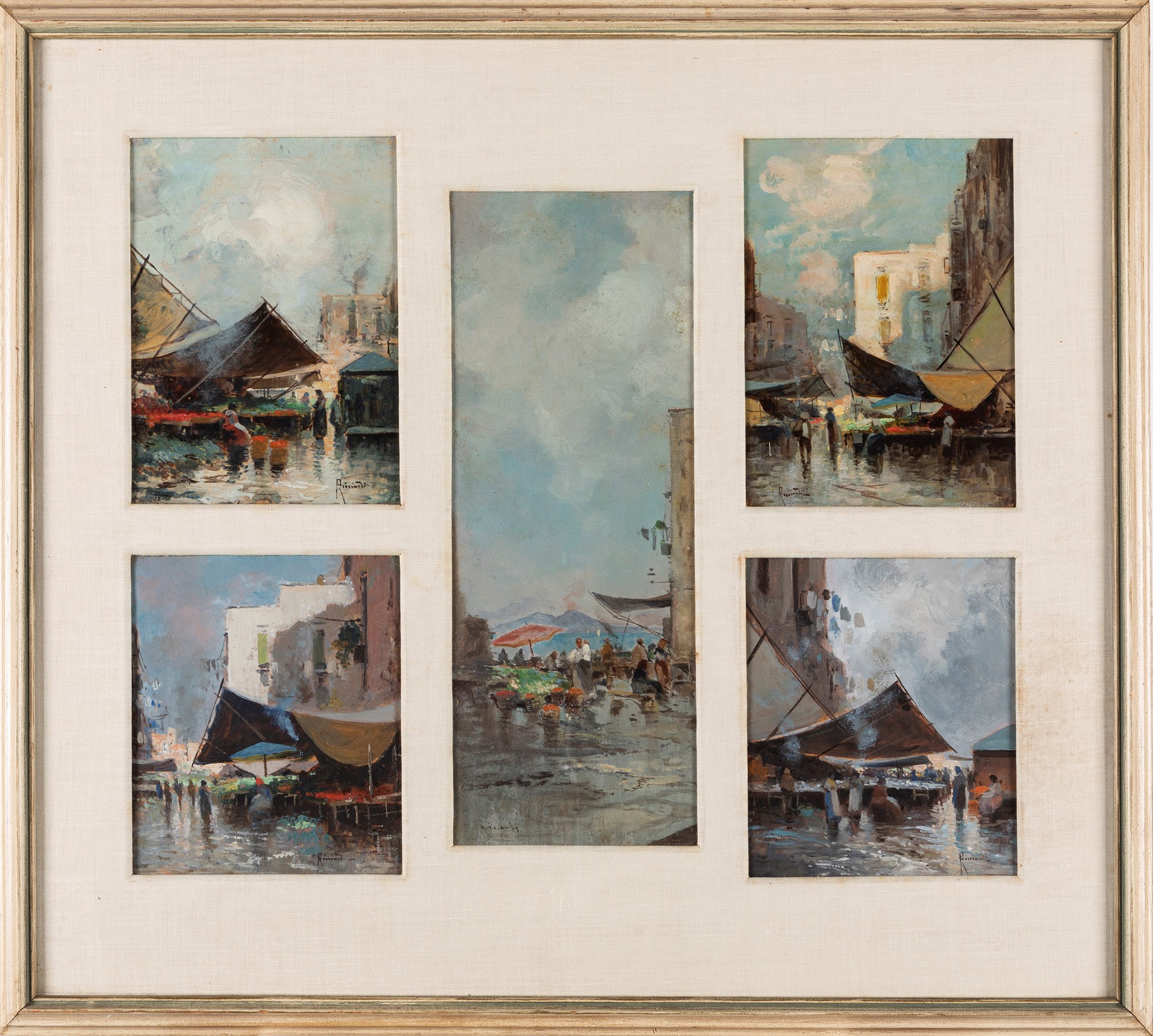 Oscar Ricciardi (Napoli 1864-1935) - Cinque scene di mercato a Napoli montate in un'unica cornice
