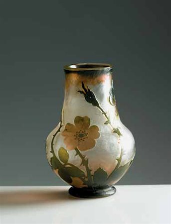 Daum. Vaso in vetro a cammeo con decoro a rose, 1900 circa. Firma incisa:...