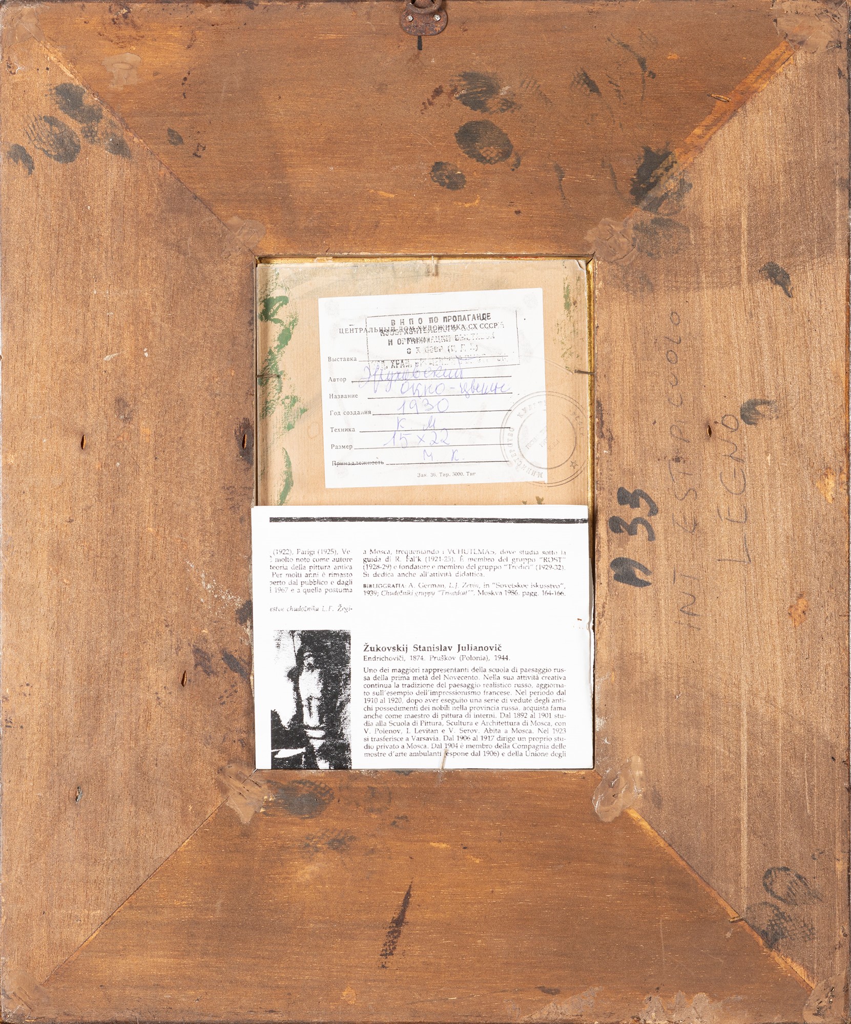 Sul retro, etichetta manoscritta e timbri di esportazione.