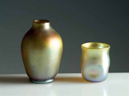 Tiffany. Piccolo vaso e bicchiere in vetro iridato, l’uno con corpo ovoidale...