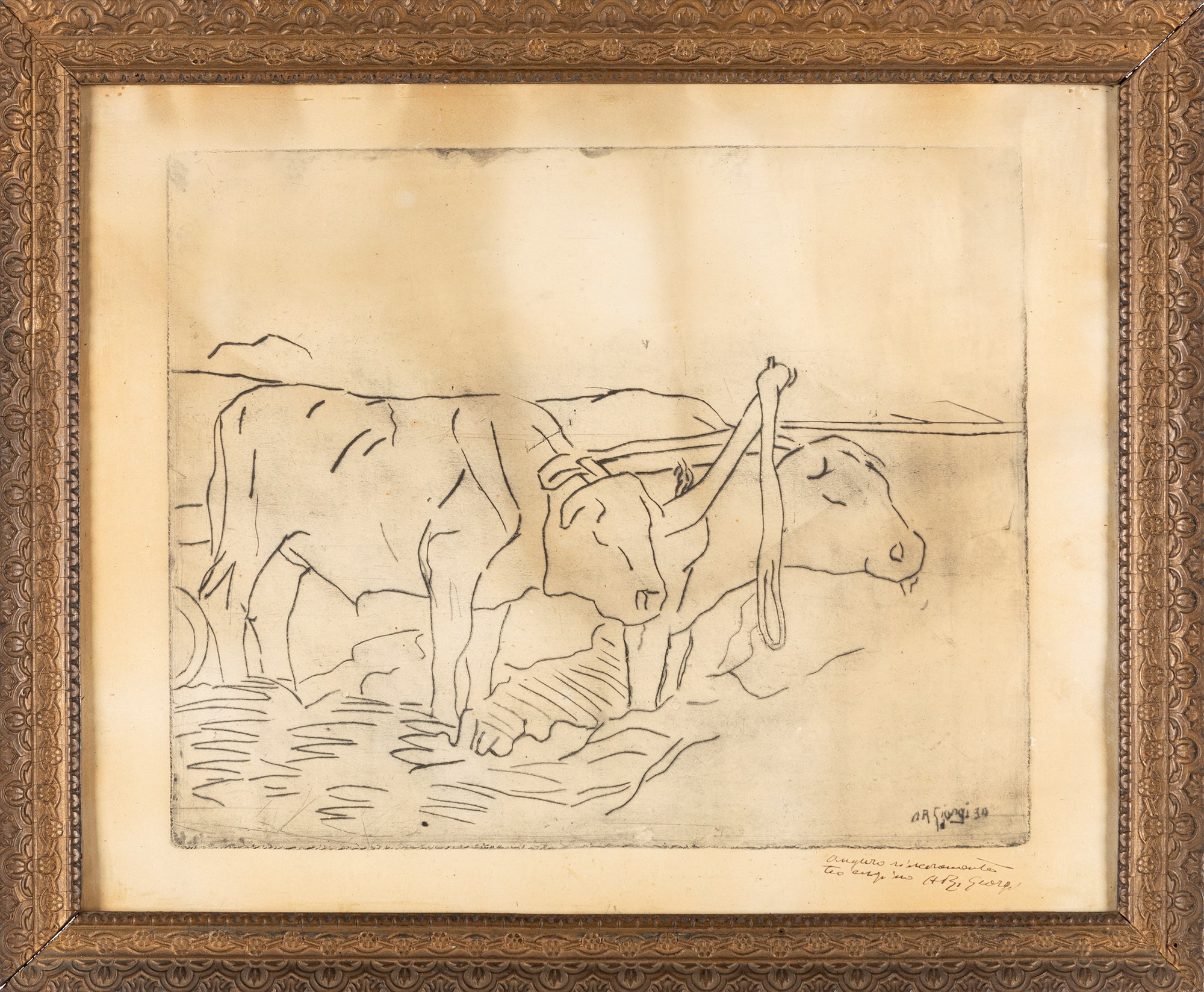 firmato e datato in lastra: A R Giorgi 30 e dedica a penna sul foglio: auguro sinceramente / tuo cugino A R Giorgi
