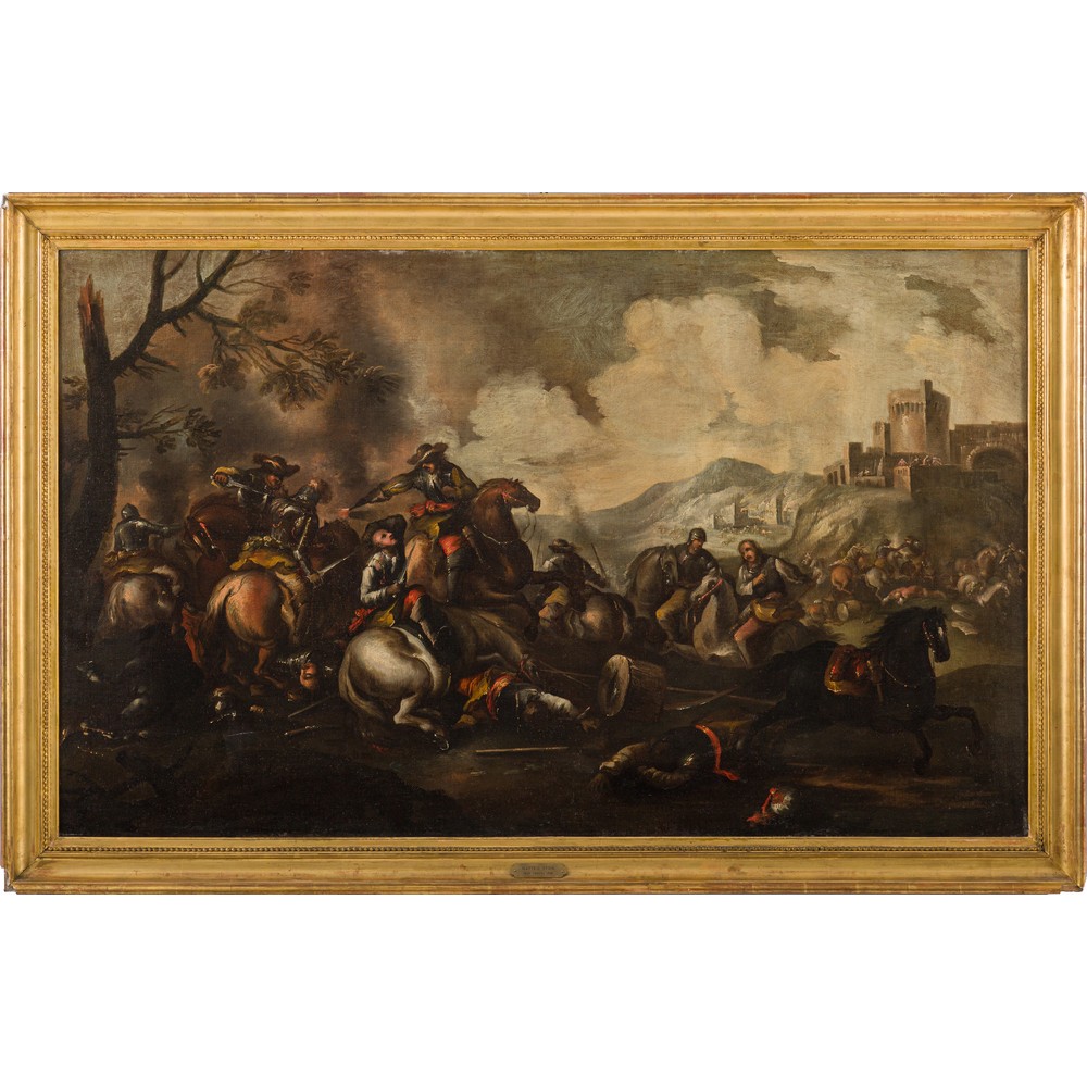 Battaglia con soldati a cavallo e castello sullo sfondo