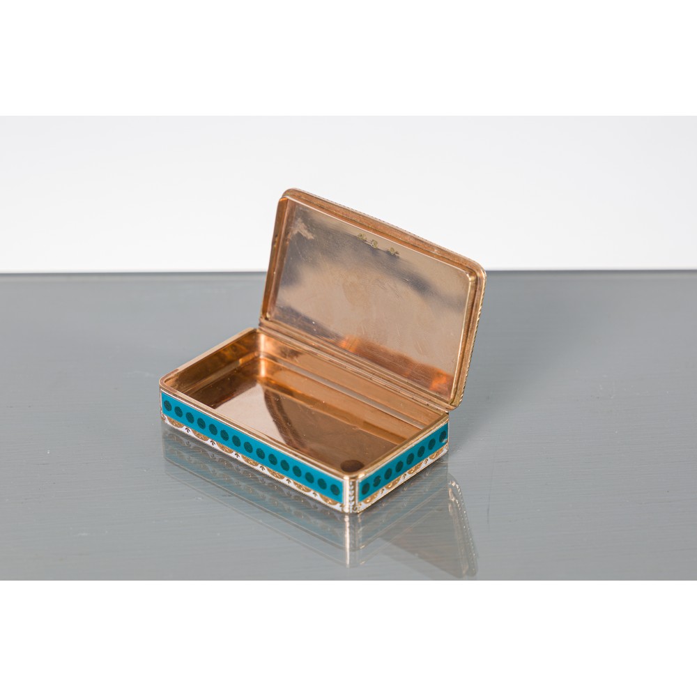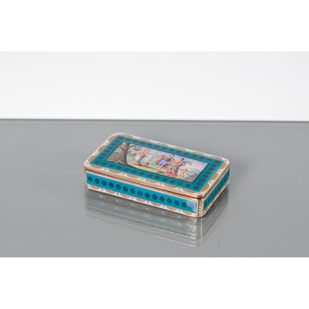 Scatola in oro giallo 18 KT e smalti, raffigurante scena neoclassica sul coperchio (g. 80,6).
