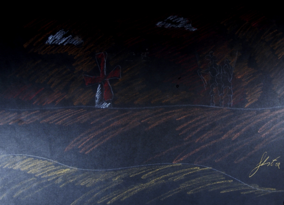 FESTA TANO (Roma 1938 - Roma 1988) "Cavalieri e mulino a vento" Pastelli su...