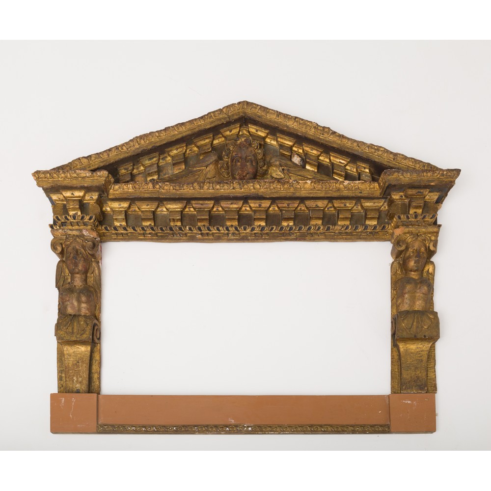 Edicola in legno di pioppo dorato e laccato con putto alato centrale, laterali a lesene con figure di arpie.