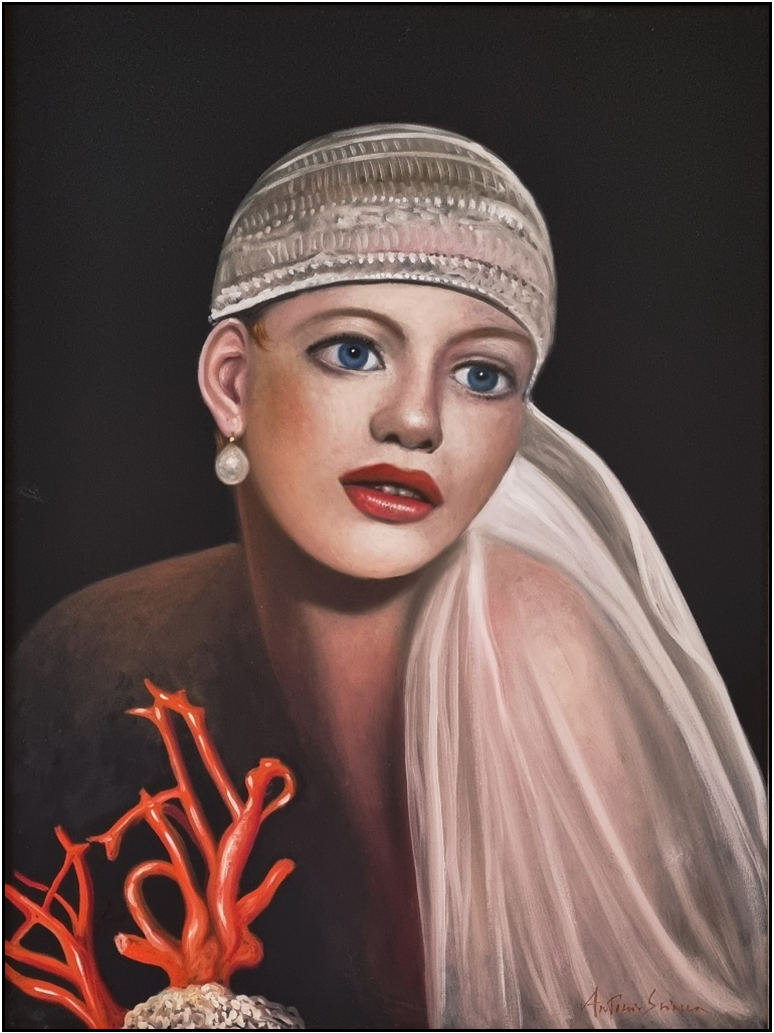 SCIACCA ANTONIO Catania 1957 “Figura femminile” olio su tela cm 60x80. Firmato sul fronte in basso a destra. Sul retro titolo e firma. Autentica su foto a cura dell’artista e foto dell’artista ritratto con l’opera.