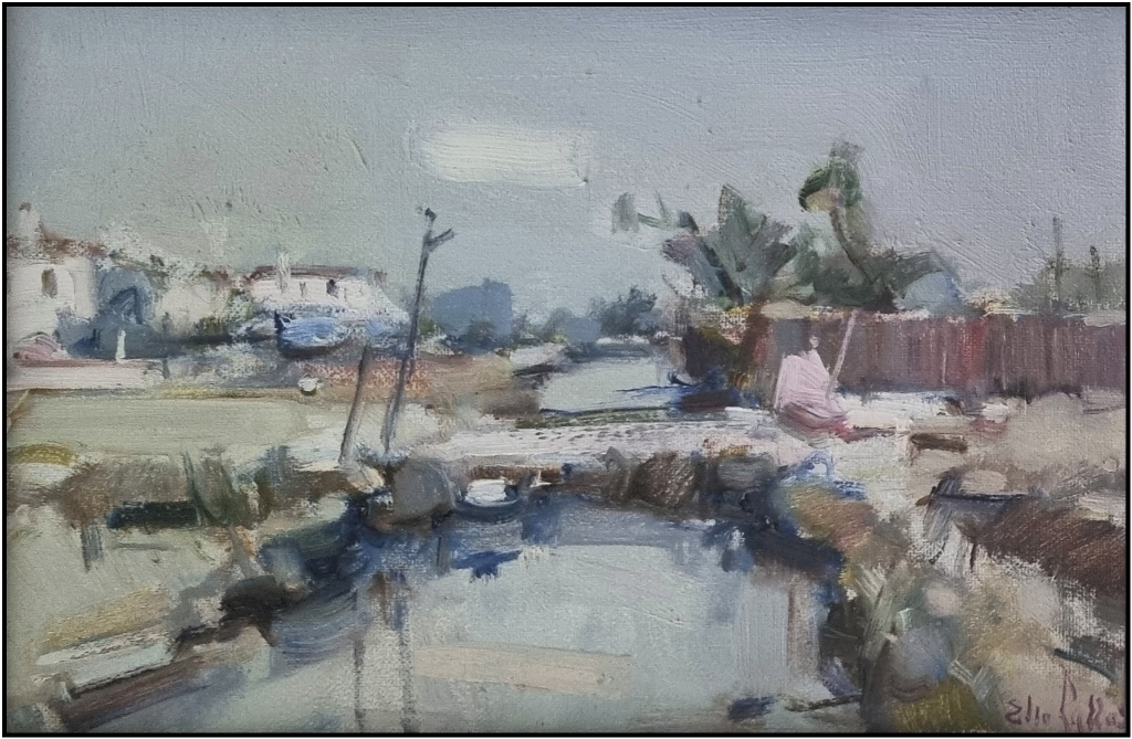 LAZZARI ELIO Venezia 1942 "Paesaggio lagunare" olio su tela cm 30x20 del '57. Firmato sul fronte in basso a destra. Sul retro titolo, firma, data e luogo.