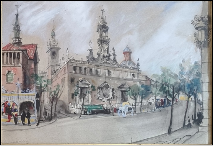 CARRARO MARIO Mestre 1896-1978 "Valencia" acquerello su carta cm 50x40. Intitolato sul fronte in basso a sinistra, firmato e datato a sinistra.