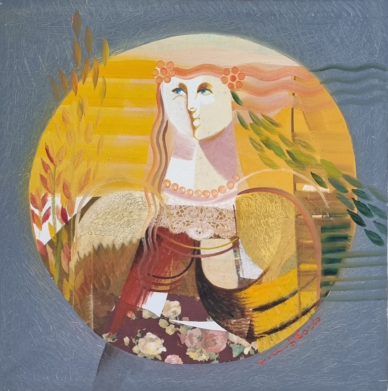 DI CARLO MARIA VITTORIO Foggia 1939– Milano 2015 "Figura" olio e collage su tela cm 70x70. Firmato sul fronte in basso a destra. Sul retro firma ed etichetta descrittiva con numero d'archivio.
