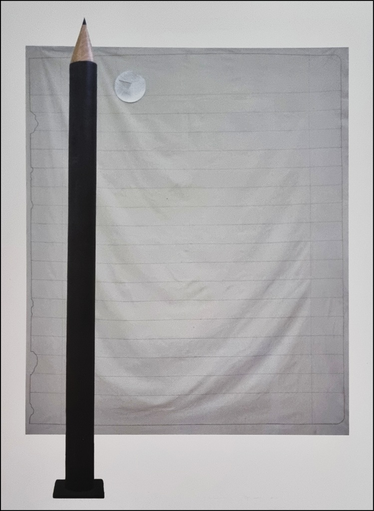 MICCINI EUGENIO Firenze 1925-2007 “Anche il silenzio è parola” installazione composta da due elementi: matita in legno/cartone cm 357 di altezza e cm 21 di diametro, stoffa serigrafata e metallo cm 300x250 del 1991. Opera pubblicata a a pag 109 del “Catalogo Generale delle opere di Eugenio Miccini 2° volume dal 1962 al 2005”.