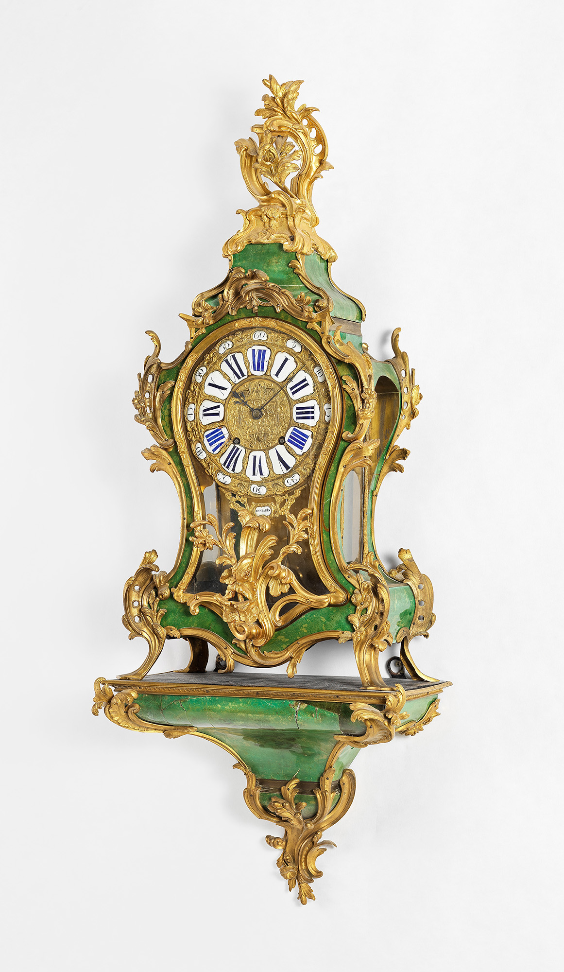 Cartel con mensola lastronata in corno verde bronzi dorati epoca Luigi XV quadrante e movimento Bon a Paris sec XVIII
