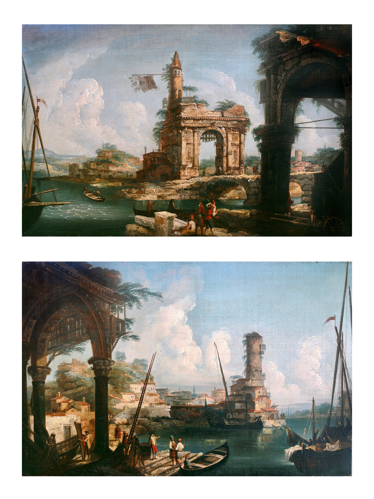 Michele Marieschi 1710/1744 e Francesco Albotto 1723/1758 coppia di oli su tela 'capriccio fluviale con archi classici' 'capriccio fluviale con architettura classica e torre circolare'.