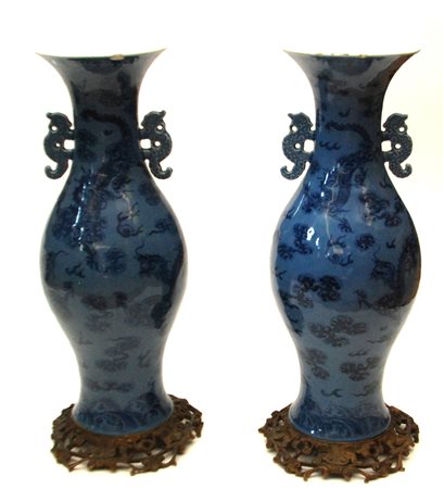 Cina coppia di vasi in porcellana bianco e blu dipinti con dragoni e nuvole