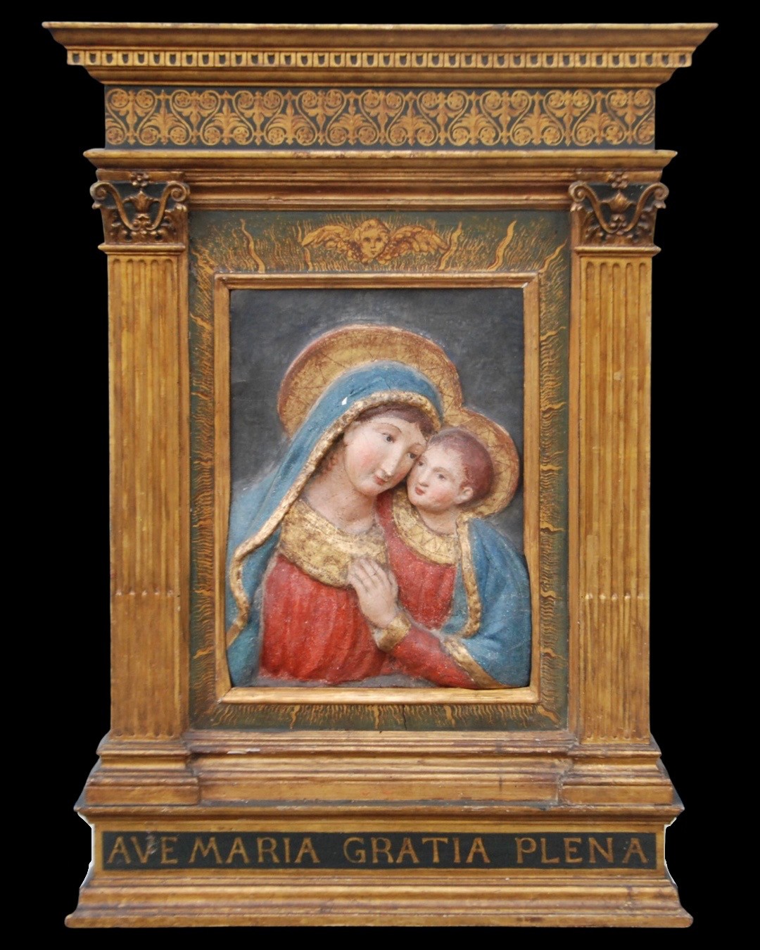 altorilievo in stucco policromo e oro 'Madonna con bambino' in cornice ad edicola laccata e dorata