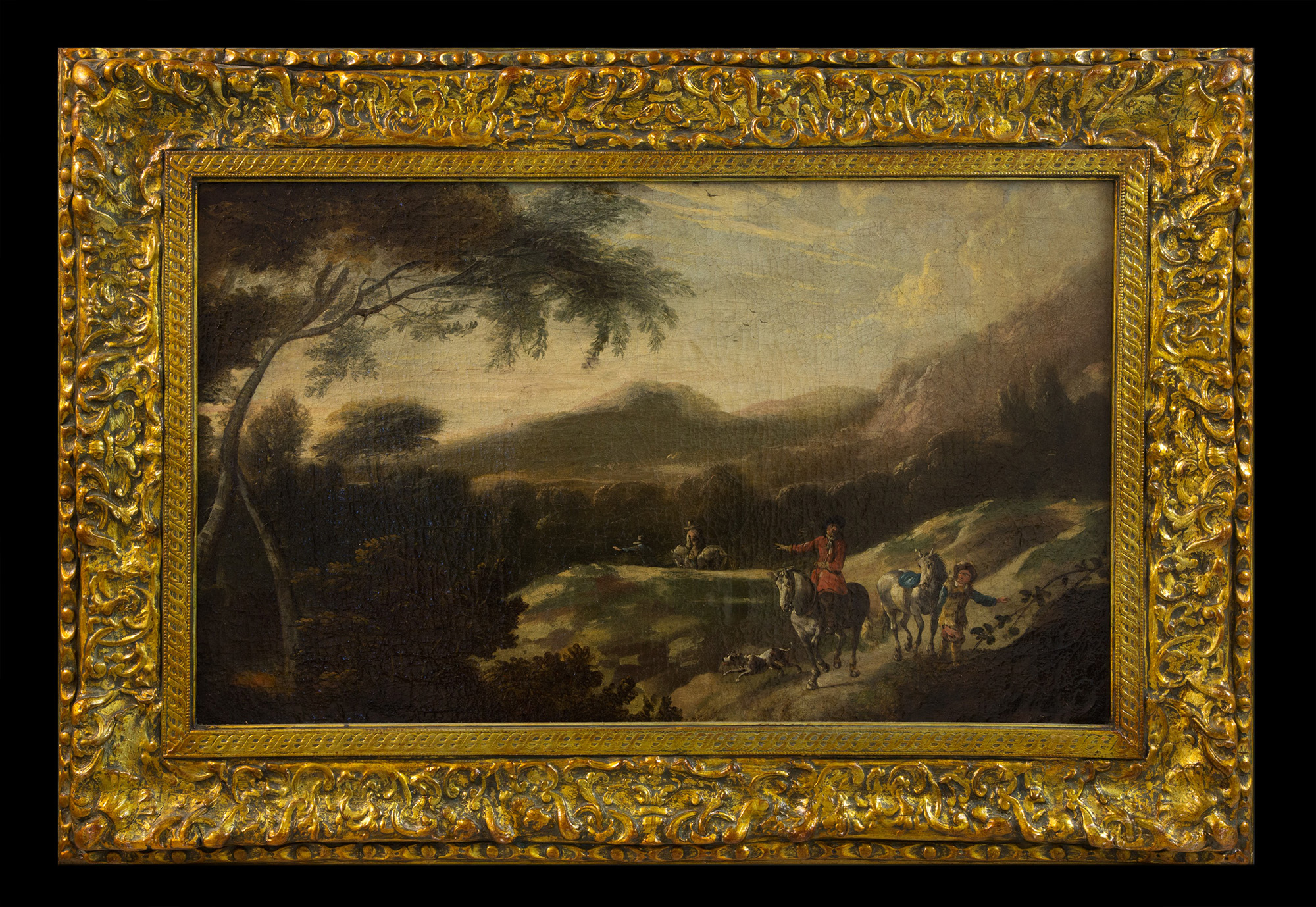olio su tela raff.paesaggio con personaggi a cavallo sec.XVIII
