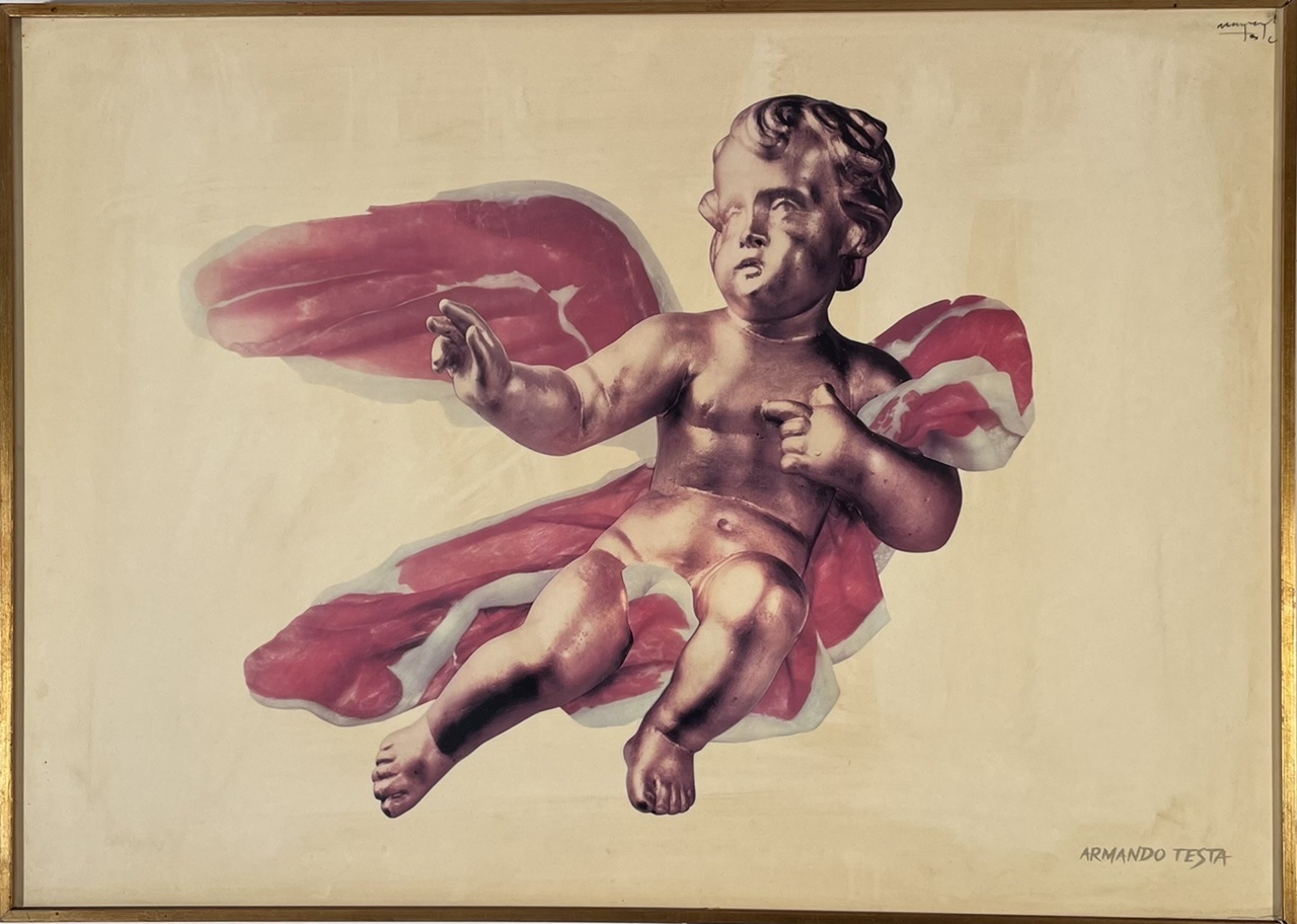 Collage fotografico raffigurante un putto in legno scolpito e dorato, con ali di prosciutto. Firmato in basso a destra. Bibliografia: Milton Glaser, Armando Testa, catalogo mostra, Torino, Allemandi, 1987, scheda n. 40.