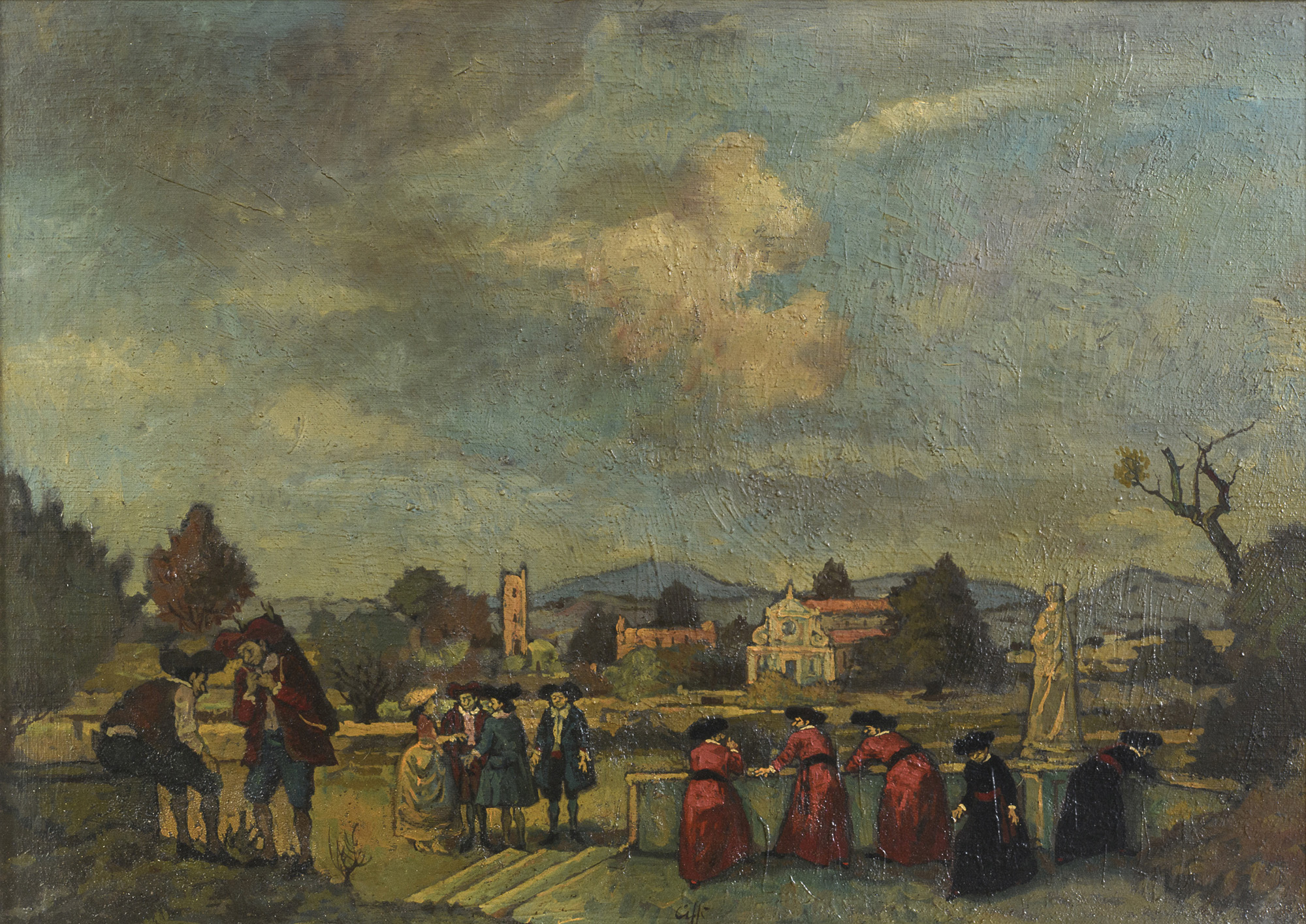 DIPINTO VEDUTA DI CITTÁ CON PRETINI DI NINO CAFFÈ