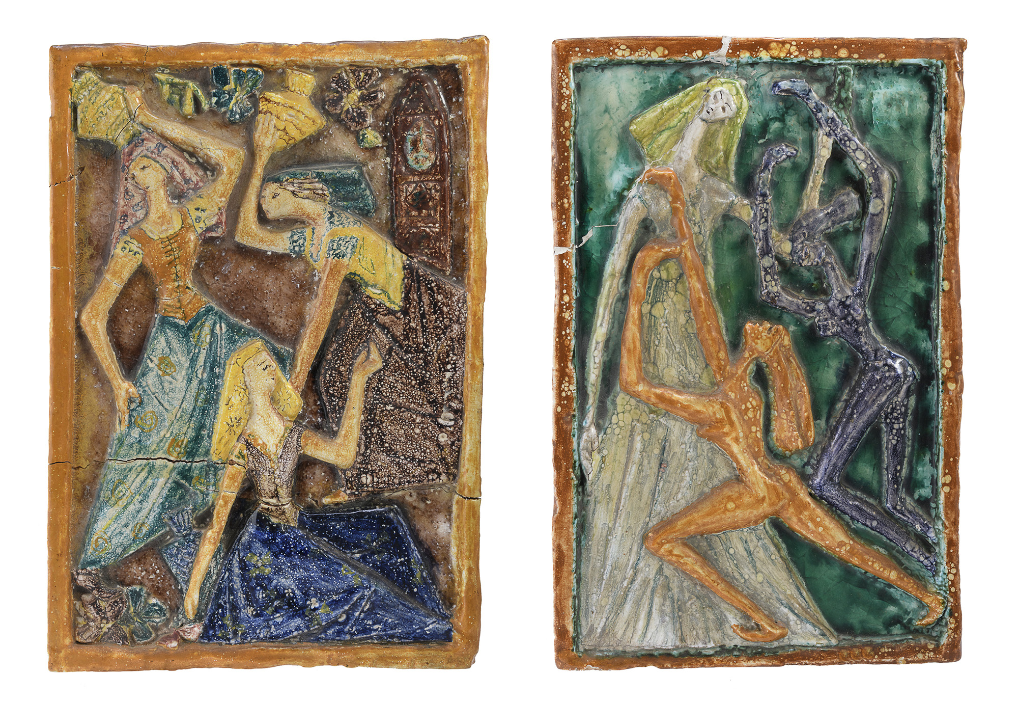 Coppia di bassorilievi in ceramica a smalti policromi, cm. 46 x 32 x 4