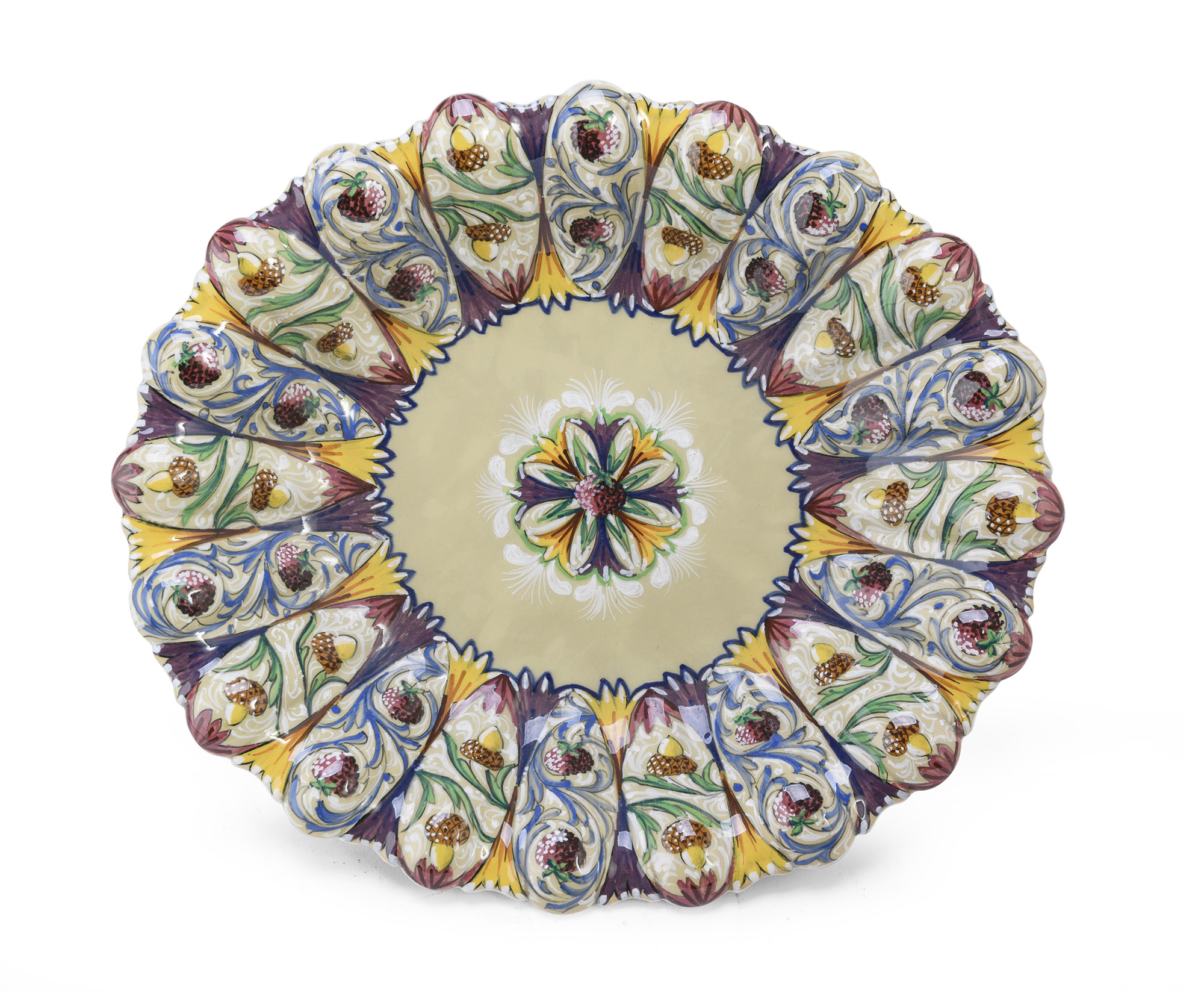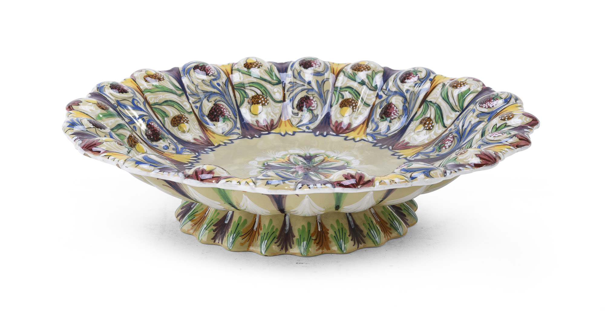 in ceramica policroma con decorazione di ghiande e frutti di corbezzolo.