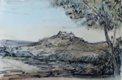 "Paesaggio" 1967 Tecnica mista su carta cm. H: 44.00 L: 66.00 Firma ed anno in basso a destra. Autentica su foto rilasciata dal figlio G. Purificato. Prov.: Galleria Fidia (Rm). Verbale di perizia su foto rilasciato dalla Galleria Pace a firma di Gimmi Stefanini, perito d'arte del Tribunale di Milano e della Procura della Repubblica Svizzera, Lugano.