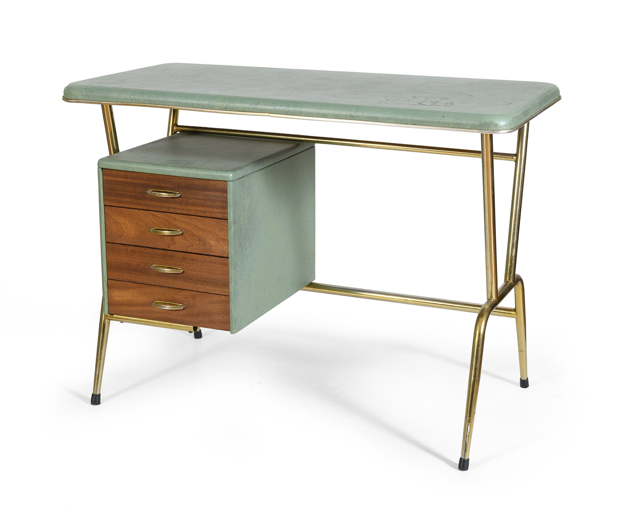 con struttura in ottone, piano rivestito in similpelle turchese con cassettiera laterale in mogano.