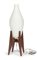 con diffusore a fondo bianco-latte a sagoma di bulbo con finitura in ottone. Supporto in legno con gambe a sagoma schiacciata.