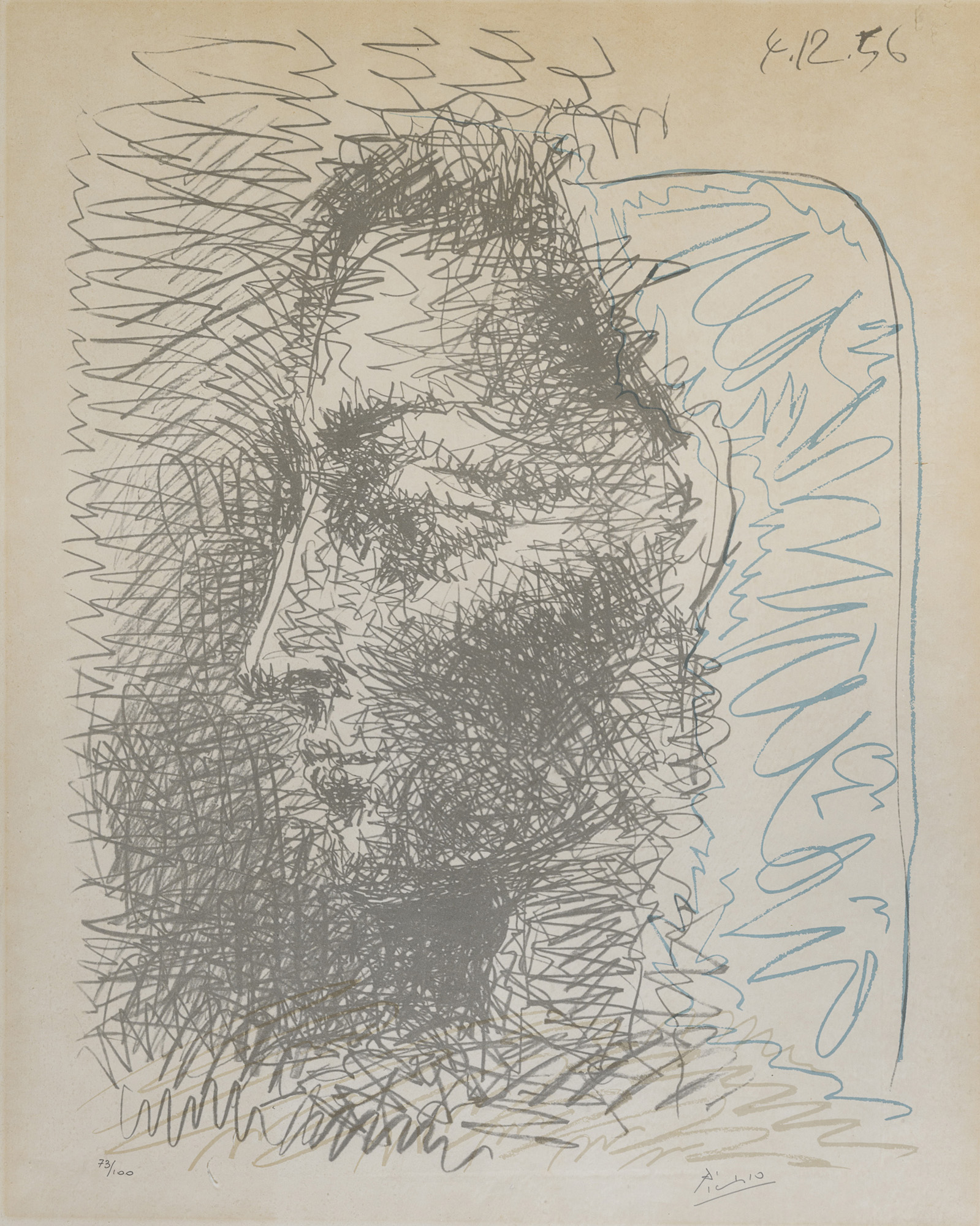 Galerie Matarasso à Nice, 21/12/1956, 31/01/1957. Au dernier moment, l’artiste recommenca et fit un deuxième portrait magnifique de Jacqueline, en trois couleurs ègalement.
