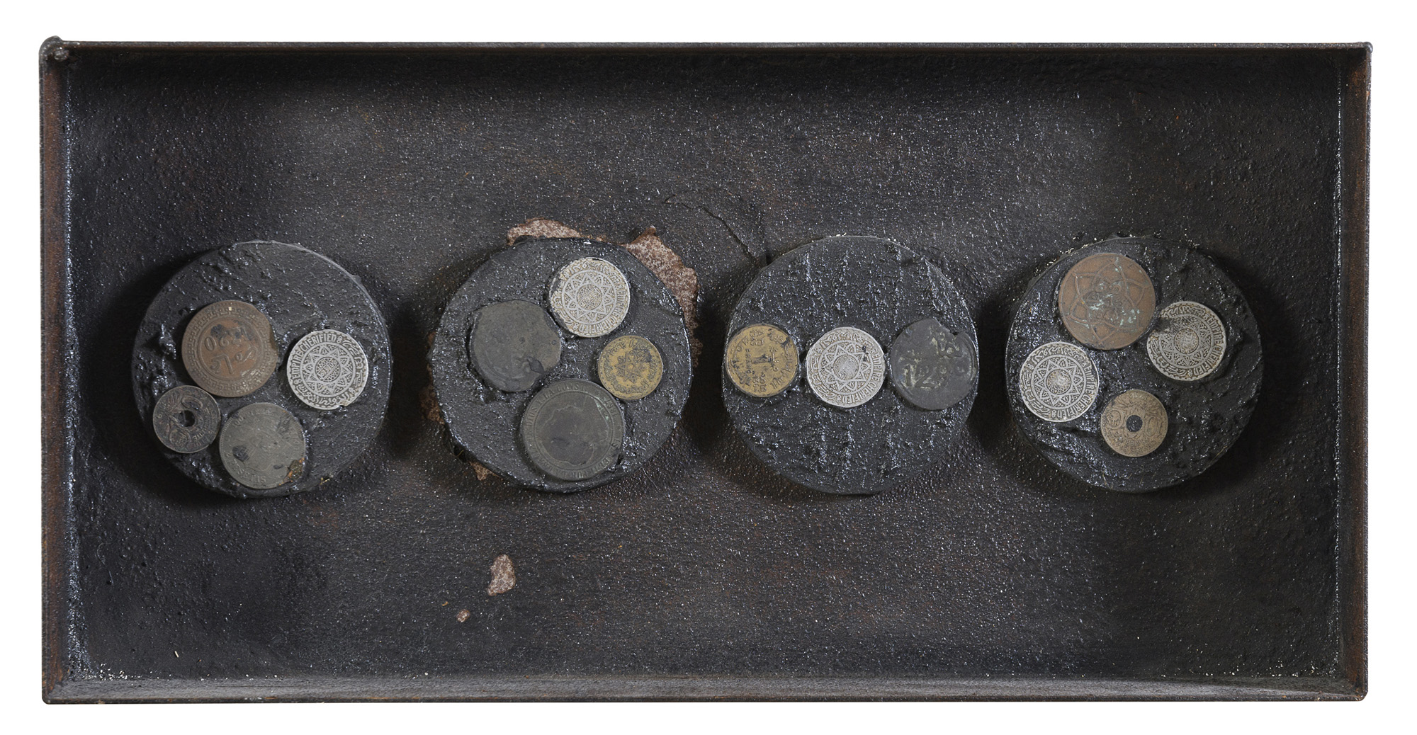 Assemblage di monete applicate su tele circolari in cassetta di ferro, cm. 20 x 40 x 5