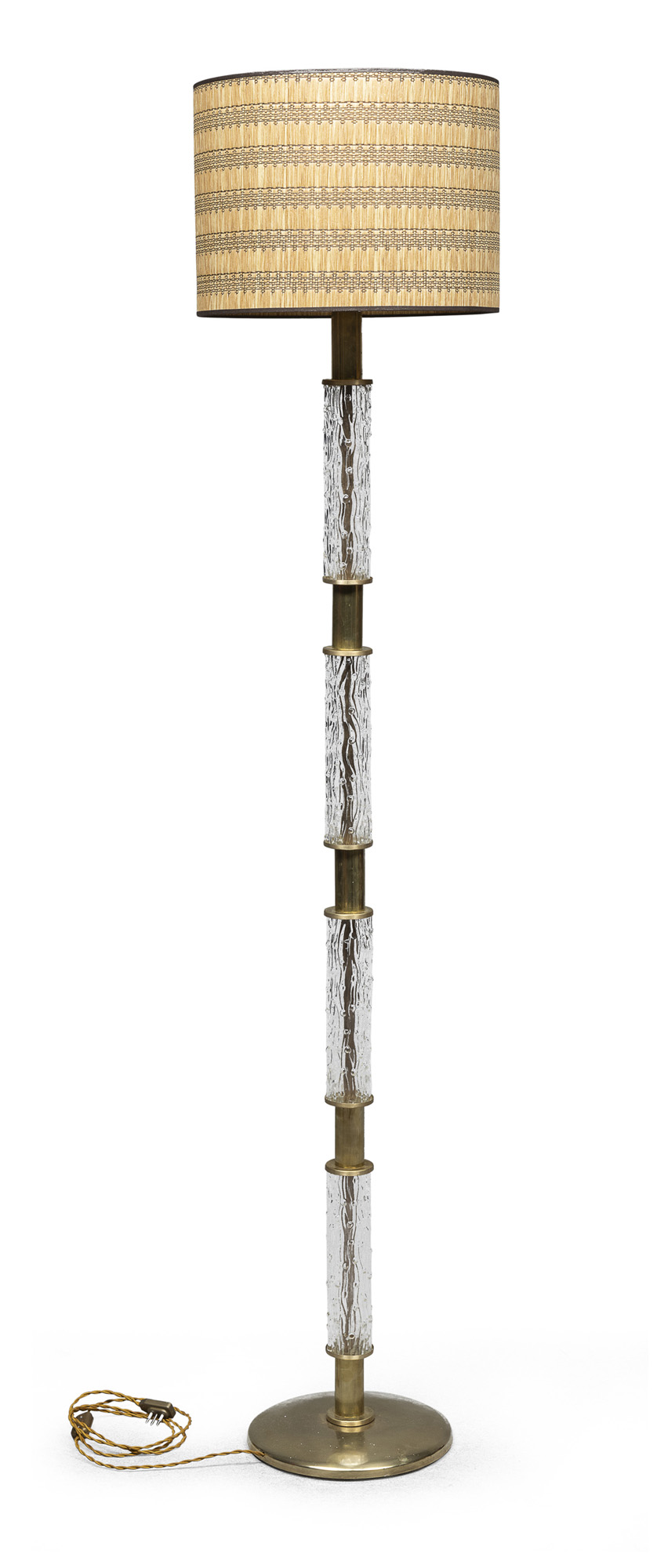 in ottone e vetro 'corteccia'. Base circolare, paralume in paglia bicolore.