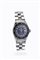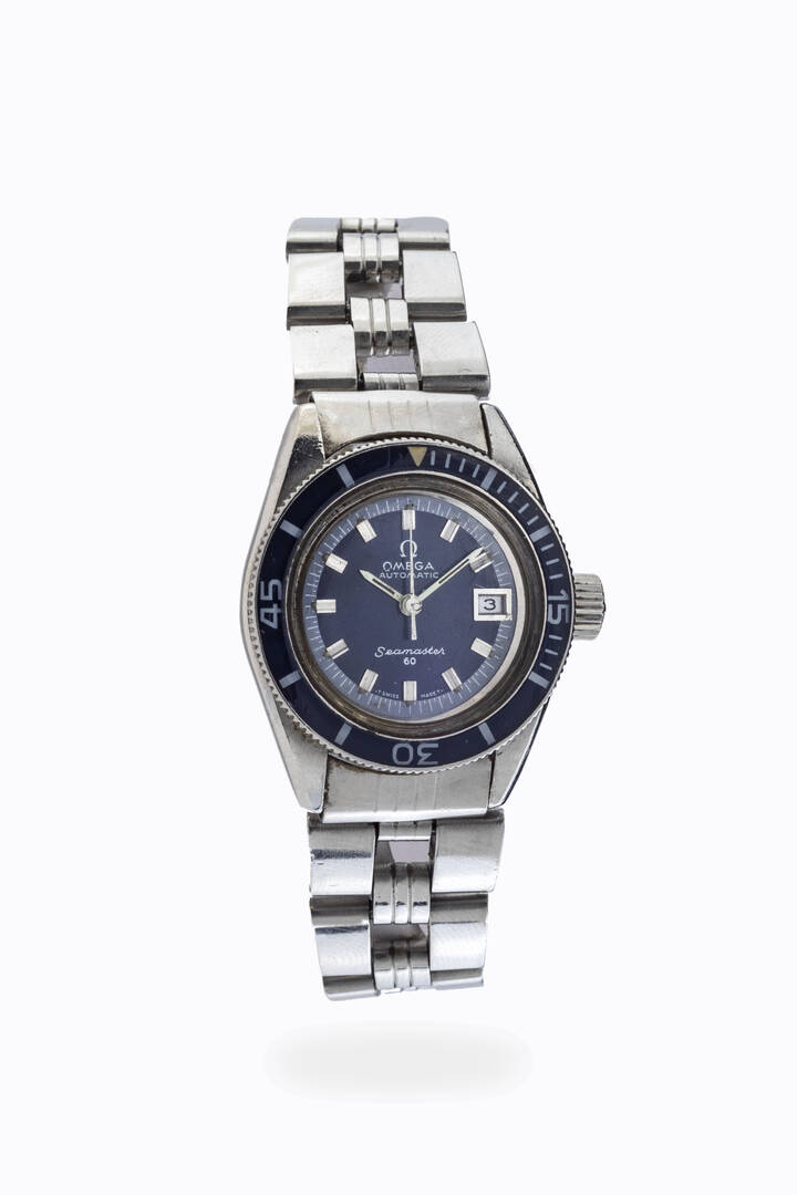 Cassa in acciaio con fondello a vite e lunetta in bakelite. Quadrante blu con indici geometrici applicati e datario al 3. Bracciale in acciaio integrato con chiusura clasp